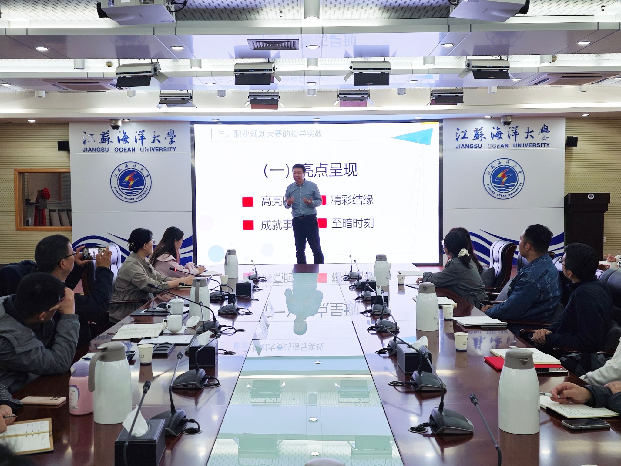 10月25日,我校于会议中心东海厅举行第二届全国大学生职业规划大赛暨江苏海洋大学第十二届大学生职业规划大赛指导教师专场培训会。全国首个高校就业指导服务规范暨ISO9001国际质量体系负责人、江苏省大学生就业创业指导专家、扬州大学就业指导中心孙鹏程老师担任此次会议培训嘉宾,各学院部分负责人、全体就业辅导员参加本次培训。本次培训会由招生与就业处主办、商学院承办,会议由商学院党委副书记王智金主持。