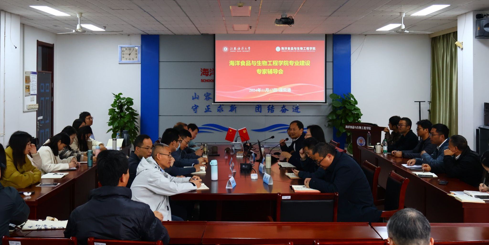 专家组由教育部高等学校食品科学与工程类专业教学指导委员会秘书长、全国工程教育专业认证专家委员会食品类专业认证分委员会副秘书长、《食品工艺学》国家一流课程负责人、江南大学教授夏文水,国家教学名师、《食品化学》国家一流课程负责人、中国海洋大学教授汪东风,江苏科技大学粮食学院院长鲁玉杰教授,南京农业大学食品科学技术学院副院长辛志宏教授,江苏大学食品与生物工程学院副院长周存山教授,以及江苏海洋大学教务处处长安俊丽教授、药学院马卫兴教授组成。海洋食品与生物工程学院院长王淑军、院党委副书记郭利、副院长盘赛昆、吴少杰及各系正副主任、各系支部正副书记、实验中心主任和专任教师参加会议。