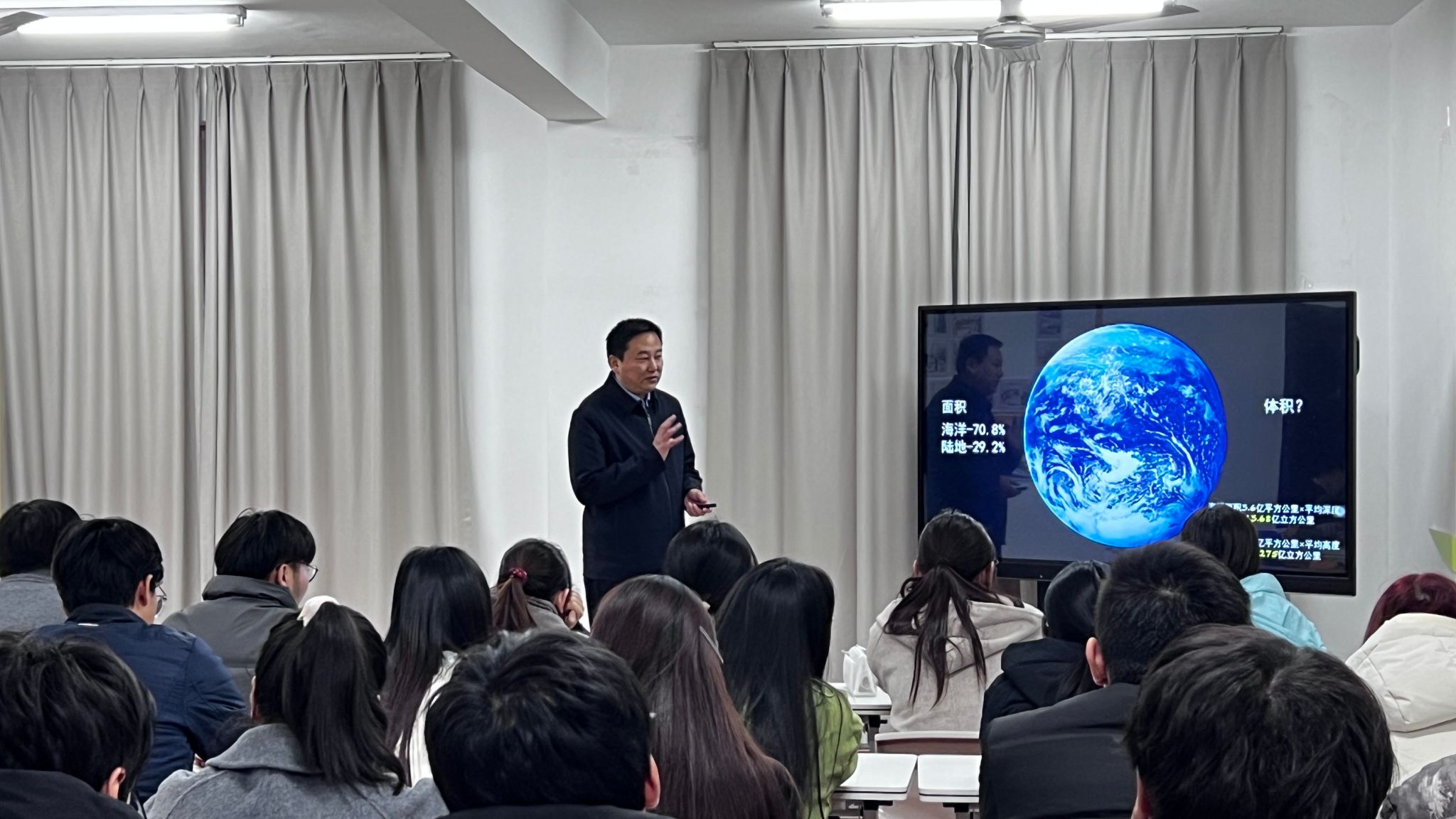 徐军田围绕习近平总书记关于海洋强国战略的重要论述,详细阐述了海洋强国战略的重大意义,向同学们介绍了江苏海洋大学向海转型发展、建设高水平海洋大学的战略目标和举措。接着从海洋科学基本概况、海洋调查与观测、海洋生物多样性三个方面为为同学们带来了一堂别开生面、生动有趣的海洋主题思政课。他指出,我国在海洋探索上研究逐步深入,正由海洋大国向海洋强国转变,同时介绍了过度捕捞、海水污染和全球变暖带来的严峻的海洋问题,鼓励同学们积极投身到海洋发展事业中去。