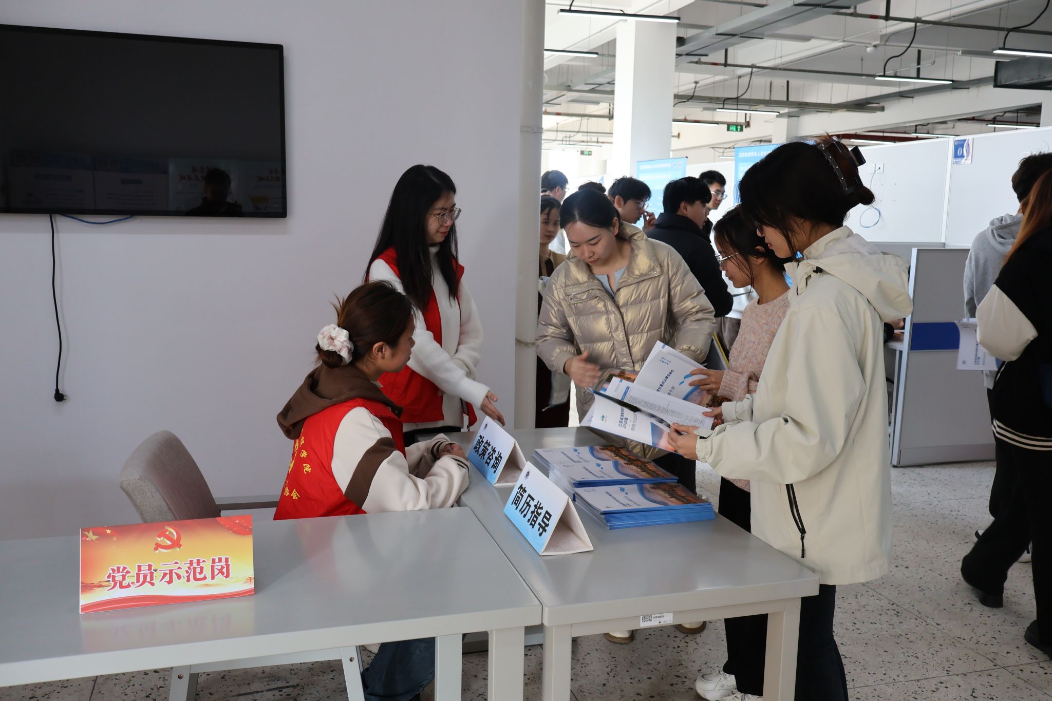 本次招聘会主要邀请了淮安市中天钢铁集团(淮安)新材料有限公司、江苏汉邦科技股份有限公司、江苏芯声微电子科技有限公司等优质企业,涉及专业广,覆盖岗位多。招聘会现场秩序井然、气氛热烈,同学们手持简历,积极与用人单位代表进行深入交流与沟通。此外,招聘会现场开设简历指导、党员示范岗、政策咨询等服务窗口,为学生提供一对一的政策解读和专业咨询。