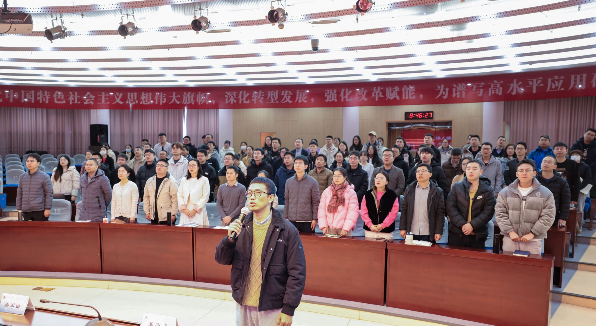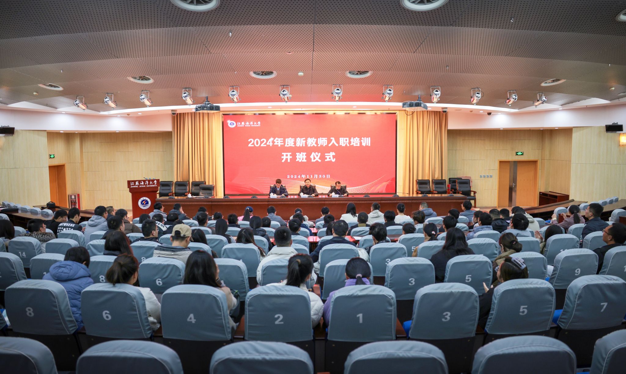 11月30日,培训开班仪式在会议中心黄海厅举行,人事处处长蒋廷臣主持开班仪式。在开班仪式上,副校长徐军田作了培训动员讲话。他强调新教师要以本次培训为契机,树立正确的理想信念和价值观,学习先进的教育思想和教学理念,养成良好的职业道德和敬业精神。同时对新入职教师提出了四点期望:一要以德治教,加强修养;二要身先垂范、勇于担当;三要终身学习,持之以恒;四要精心规划,成就梦想。