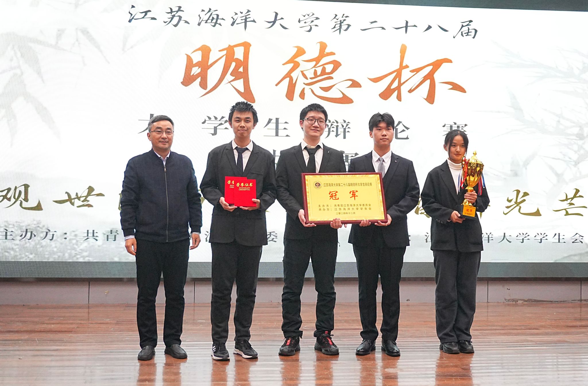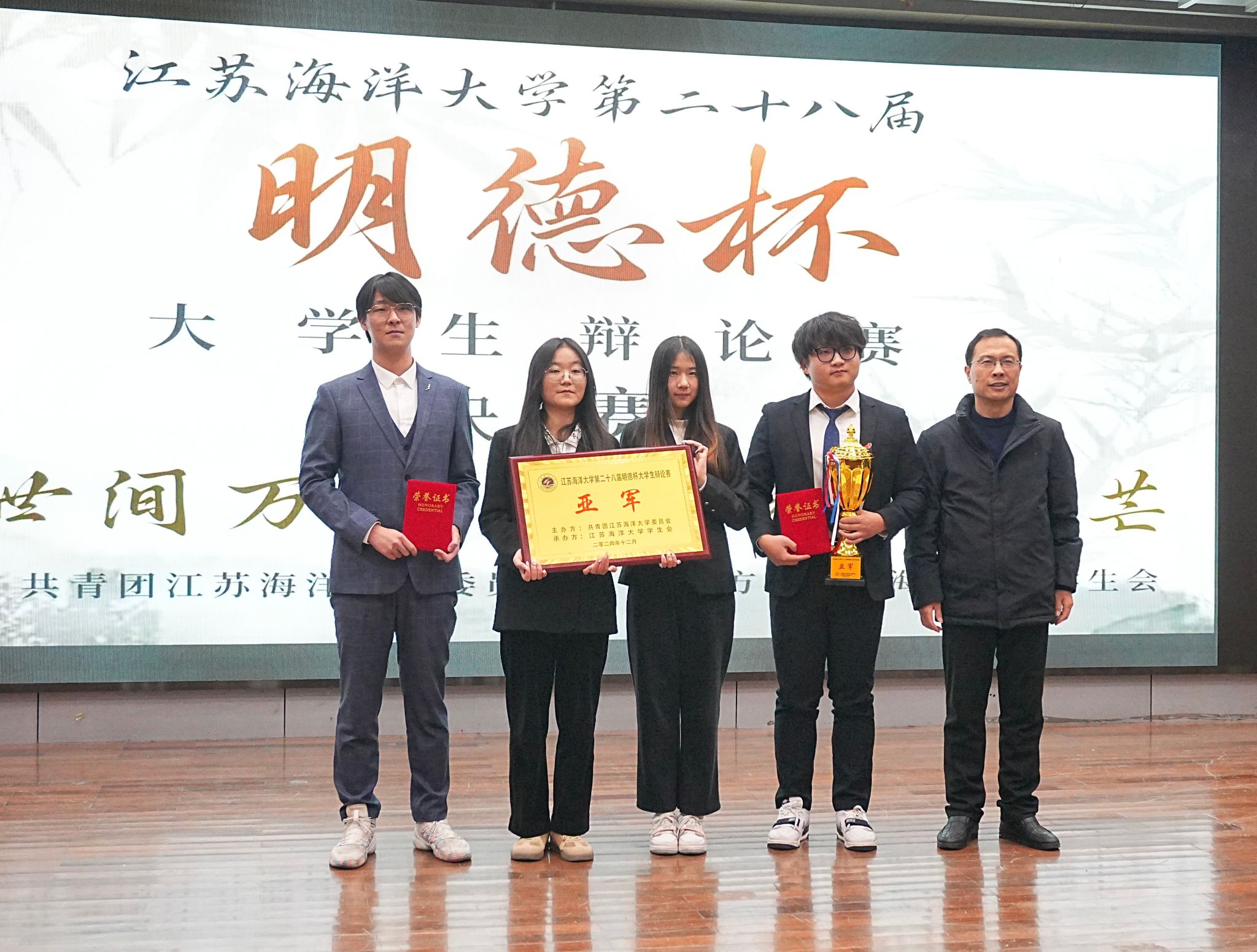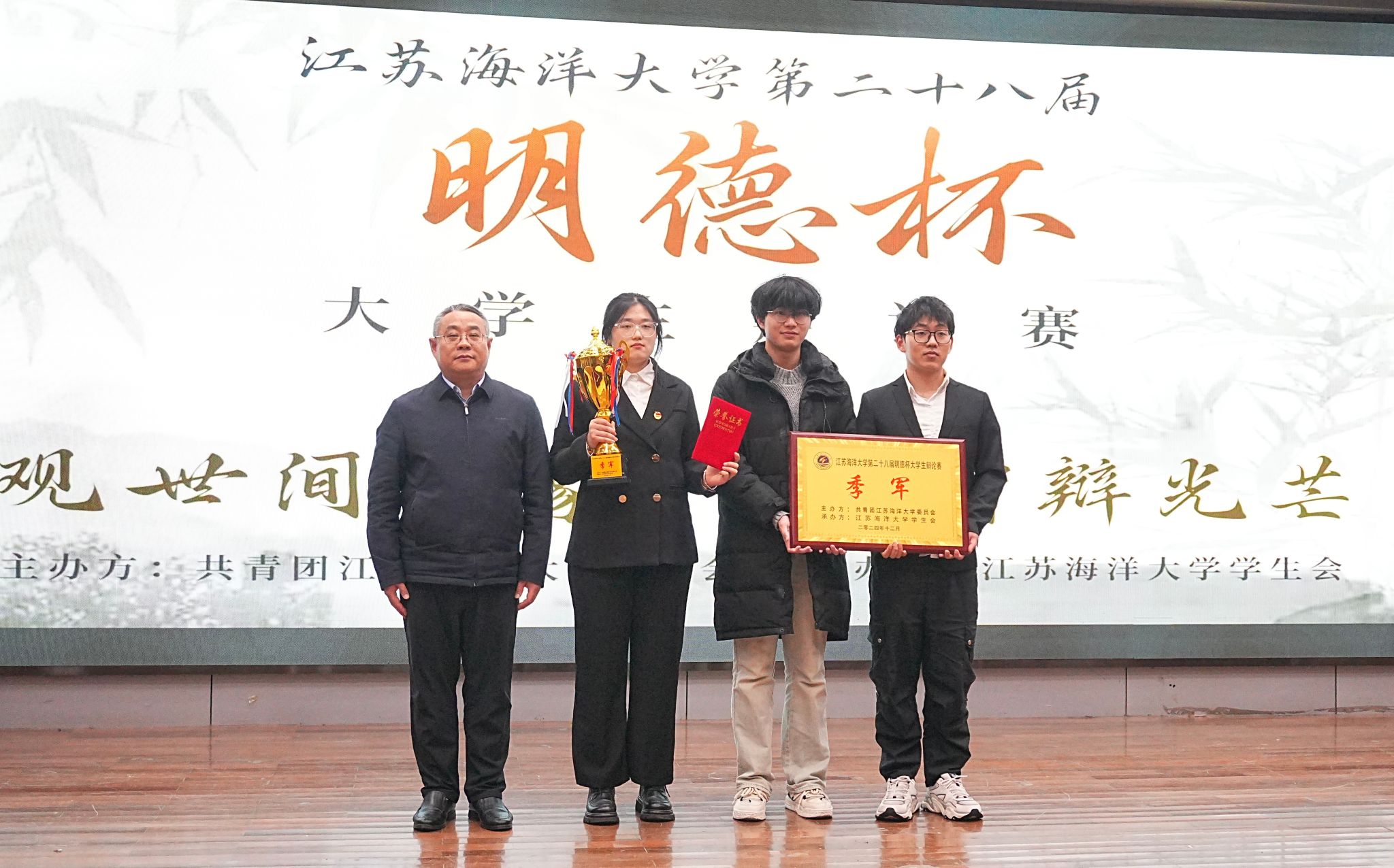 12月5日晚,江苏海洋大学第二十八届“明德杯”大学生辩论赛决赛在艺术楼报告厅举办。党委学生工作部部长、学生工作处处长陈德翼,海洋科学与水产学院党委书记黄金虎,马克思主义学院党总支书记韩振响,校团委副书记王衍、黄媛出席比赛并担任评委。