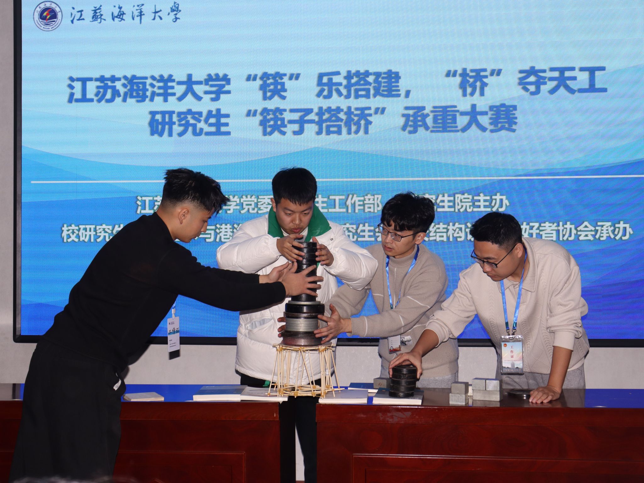 12月19日下午,由党委研究生工作部、研究生院主办,校研究生会、土木与港海工程学院研究生会和校结构设计爱好者协会共同承办的江苏海洋大学第一届“‘筷’乐搭建,‘桥’”夺天工”研究生“筷子搭桥”承重大赛在土木楼207室举办。此次大赛旨在进一步弘扬研究生的创新精神,提升研究生的创新思维、动手能力和团队合作意识,促进校园文化的多元化发展。
