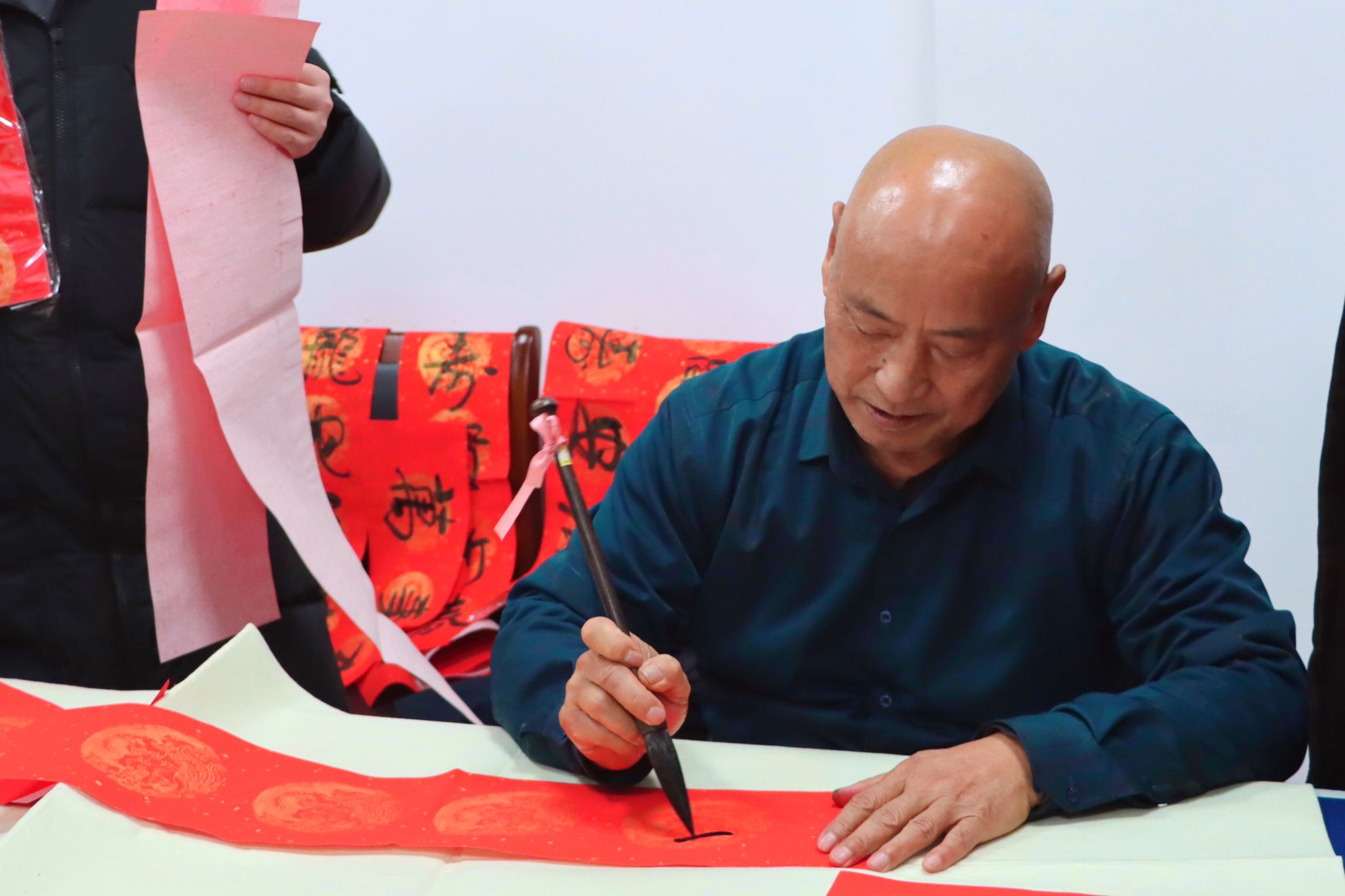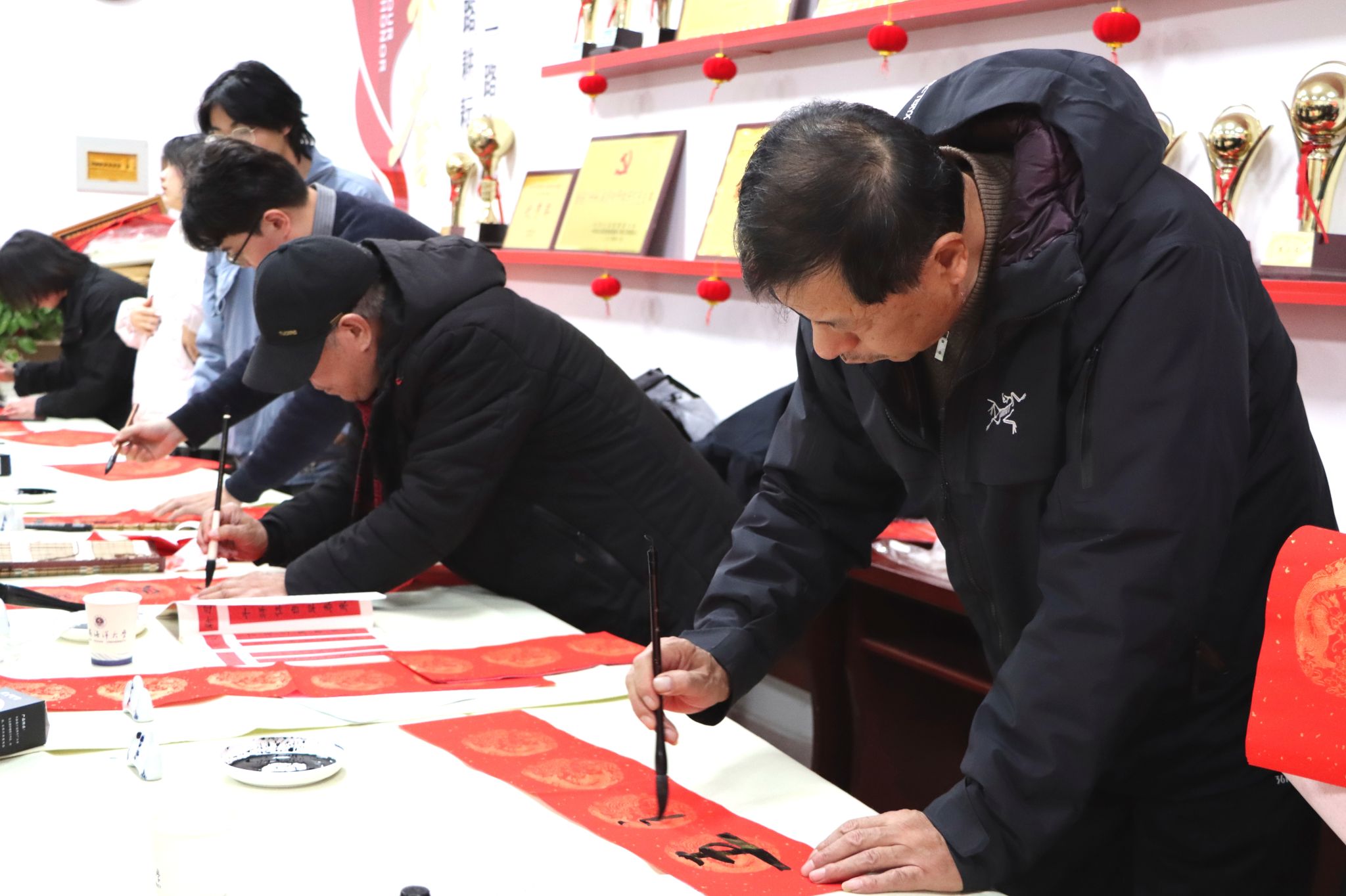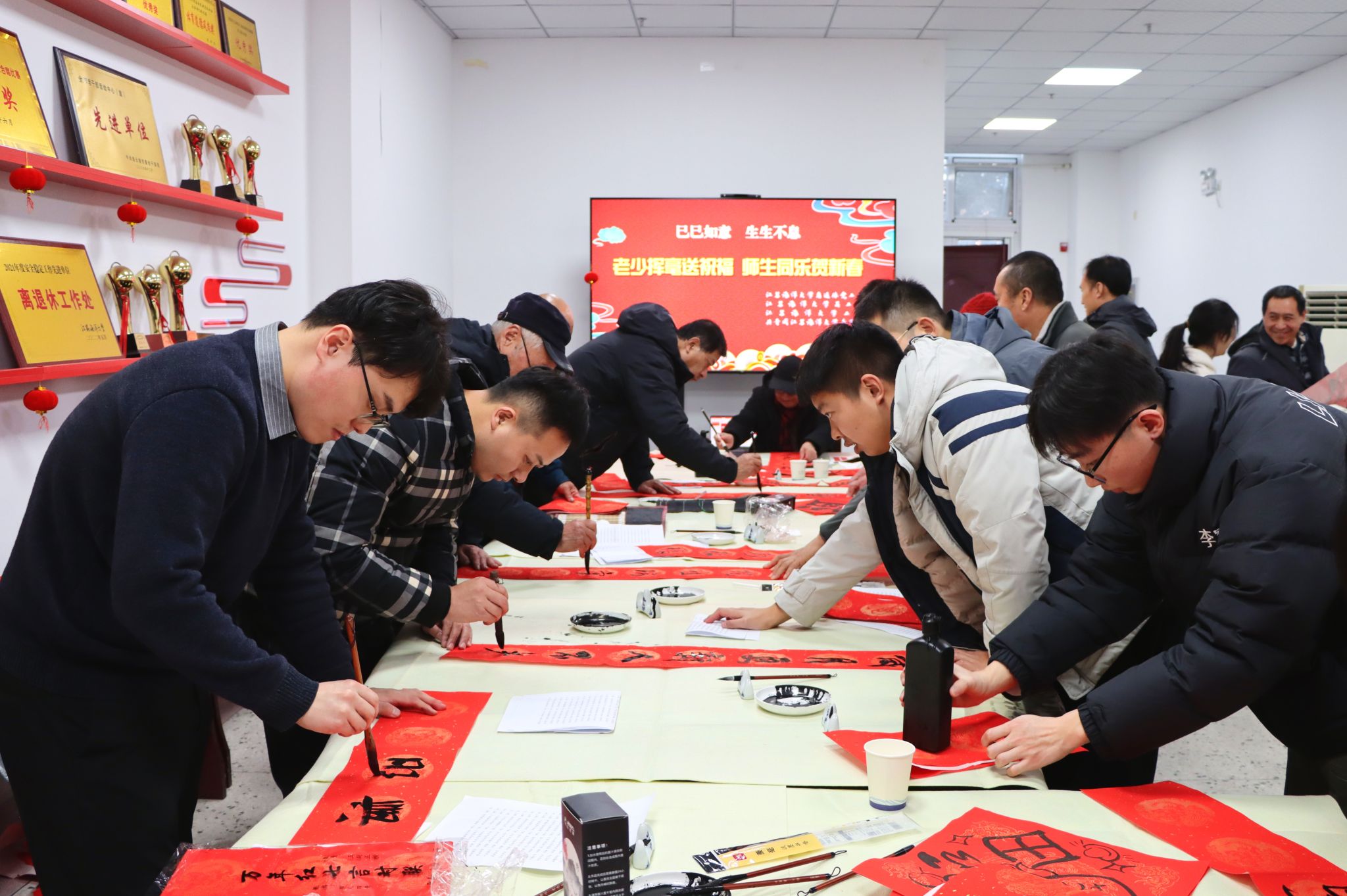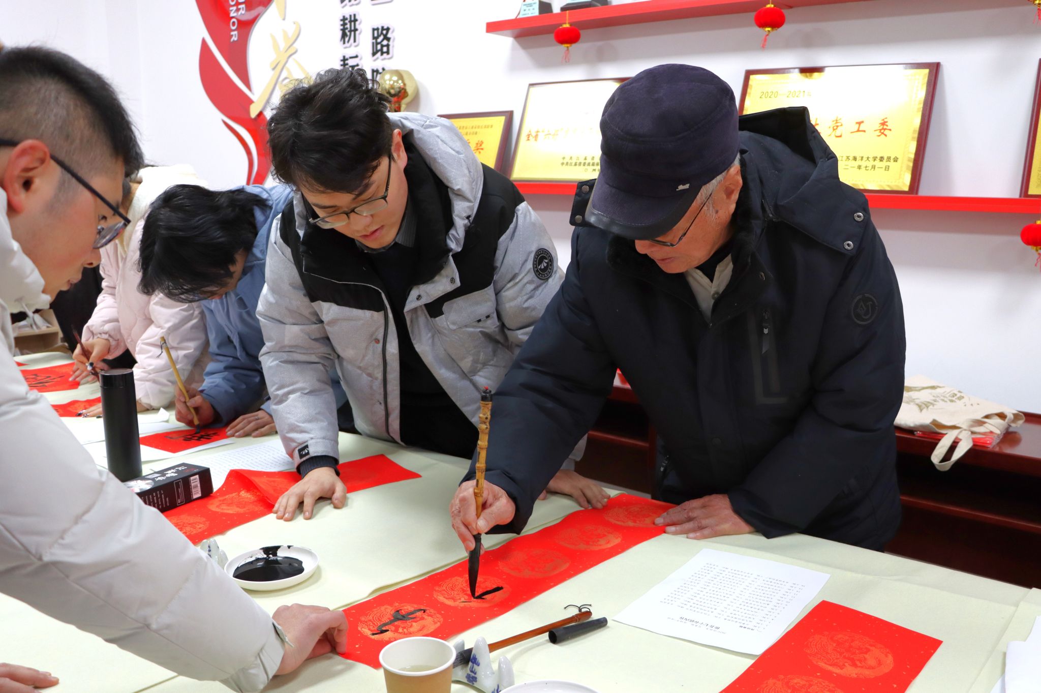 1月3日下午,校离退休工作处、关工委、工会和团委在筑海楼一楼联合举行“送福迎春”师生写春联活动。离退休老教师董立业、丁耀进、于建春、吴琼以及校团委副书记王衍、商学院辅导员曹轶文等10余师生志愿者来到现场,义务为全校师生写春联、送“福”字,共同迎接2025年新春佳节的到来。