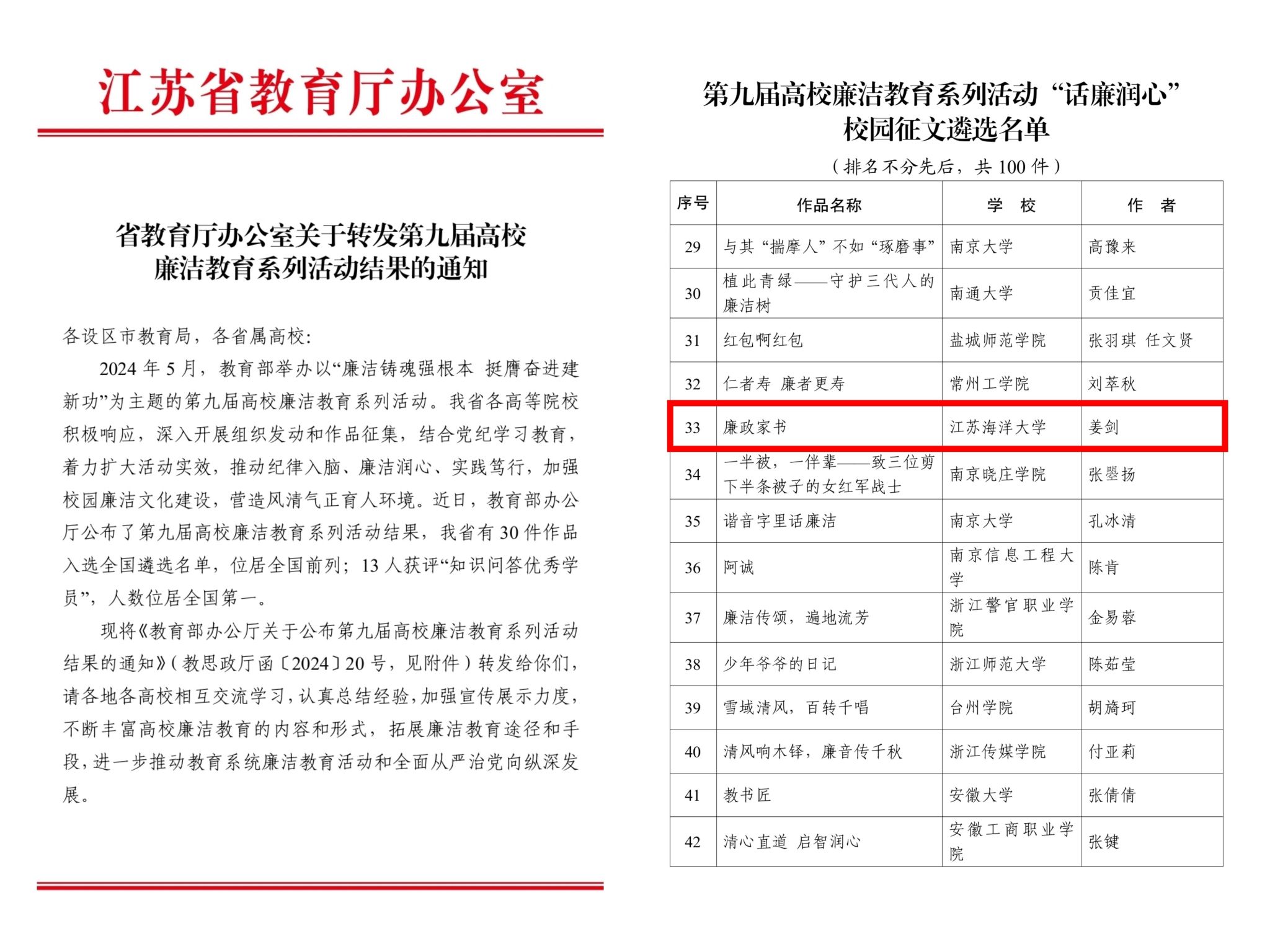 姜剑老师《廉政家书》作品入选教育部第九届高校廉洁教育“话廉润心”校园征文遴选名单