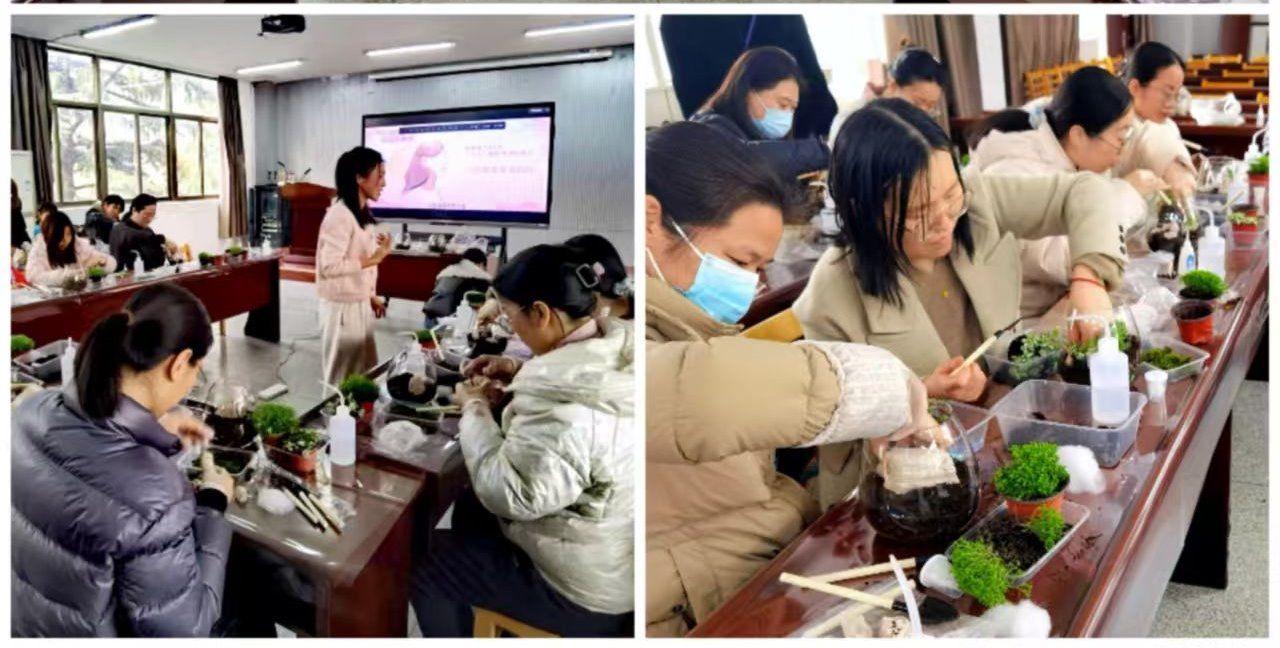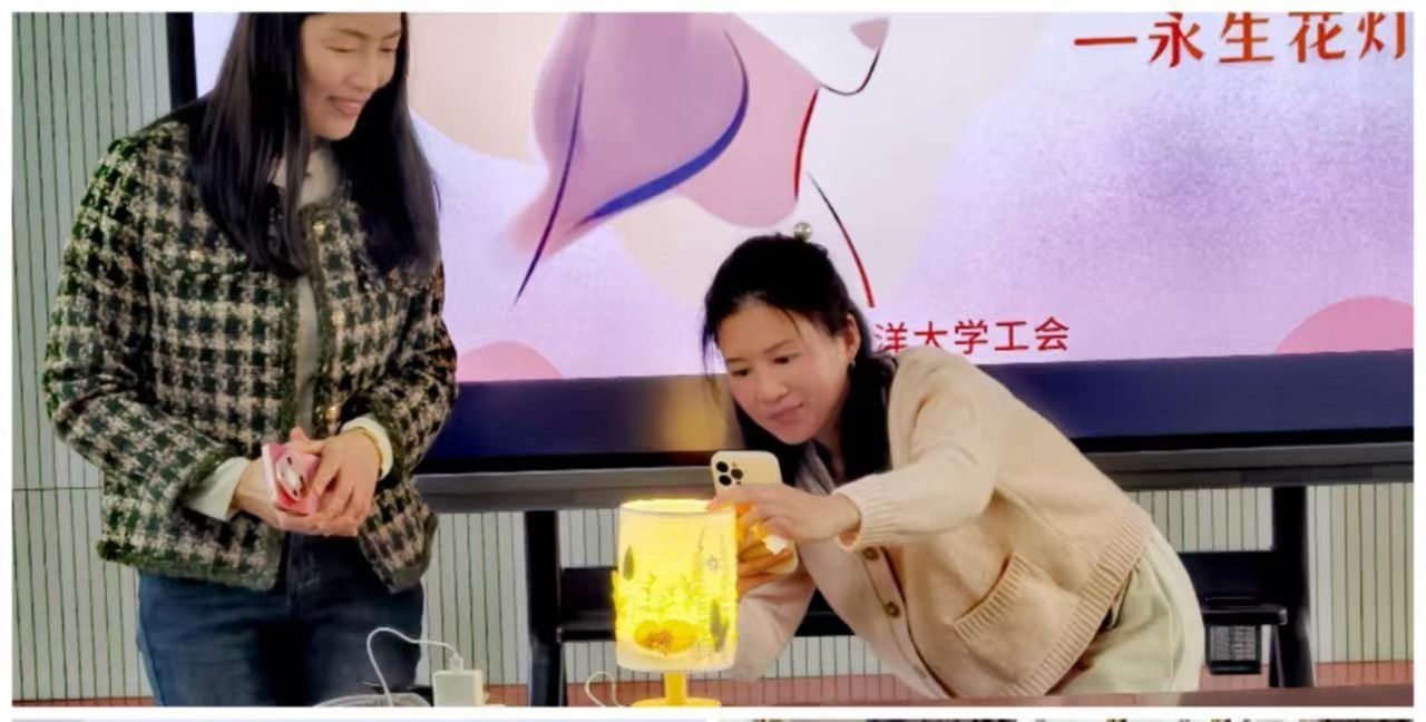 3月8日上午“珍珠手作之旅”率先拉开帷幕。活动现场,一颗颗孕育在蚌壳中的珍珠,在女教职工们的好奇与期待中被开启。每一颗珍珠的出现,都伴随着惊喜的呼声,大家纷纷感叹这是时光与运气馈赠的珍宝。在专业老师的指导下,女教职工们充分发挥创意,将这些珍珠精心制作成耳饰、胸针、戒指等精美饰品。在永生花制作活动中,女职工们纷纷动手,挑选自己喜欢的玫瑰、康乃馨等主花,搭配绣球、苔藓等辅材,精心设计、细心制作。经过裁剪、组合、固定等步骤,一盏盏独具匠心的永生花灯在她们手中诞生。