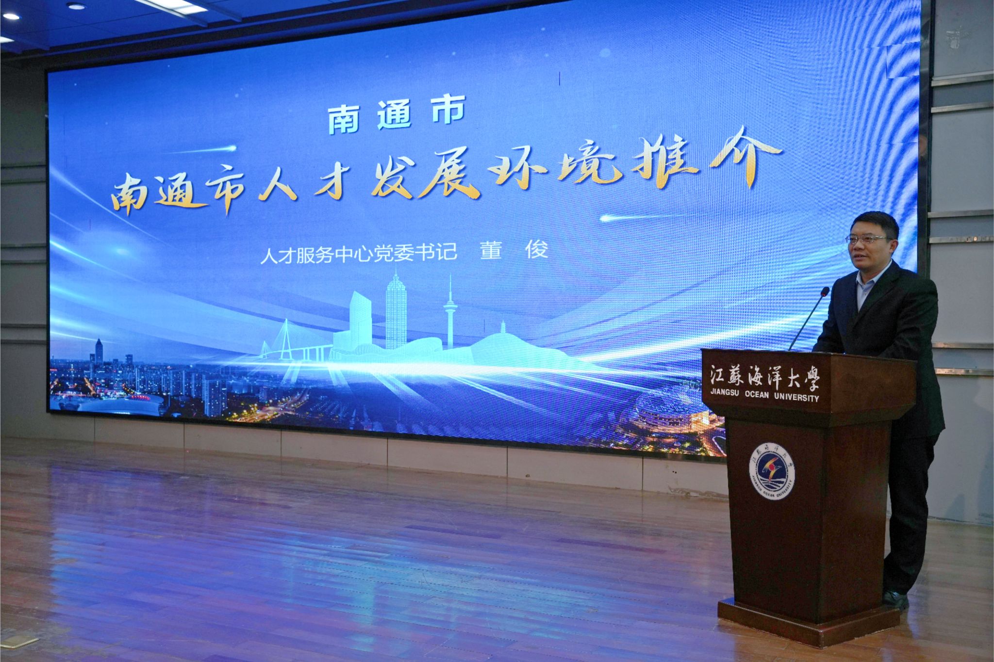 政策护航,就业服务再升级。为强化就业支持,招聘会同步在艺术楼报告厅举办人才政策宣讲会,连云港、南通、太仓、常熟等地人社局负责人现场解读就业创业补贴、落户政策、校企合作项目等利好举措。南通市人才服务中心党委书记董俊表示江苏海洋大学是南通市首批人才工作站,也是每年赴外引才的重点高校,学校学科专业设置与南通市产业发展需求十分契合,并向同学们详细介绍了南通市产业发展情况和人才政策。