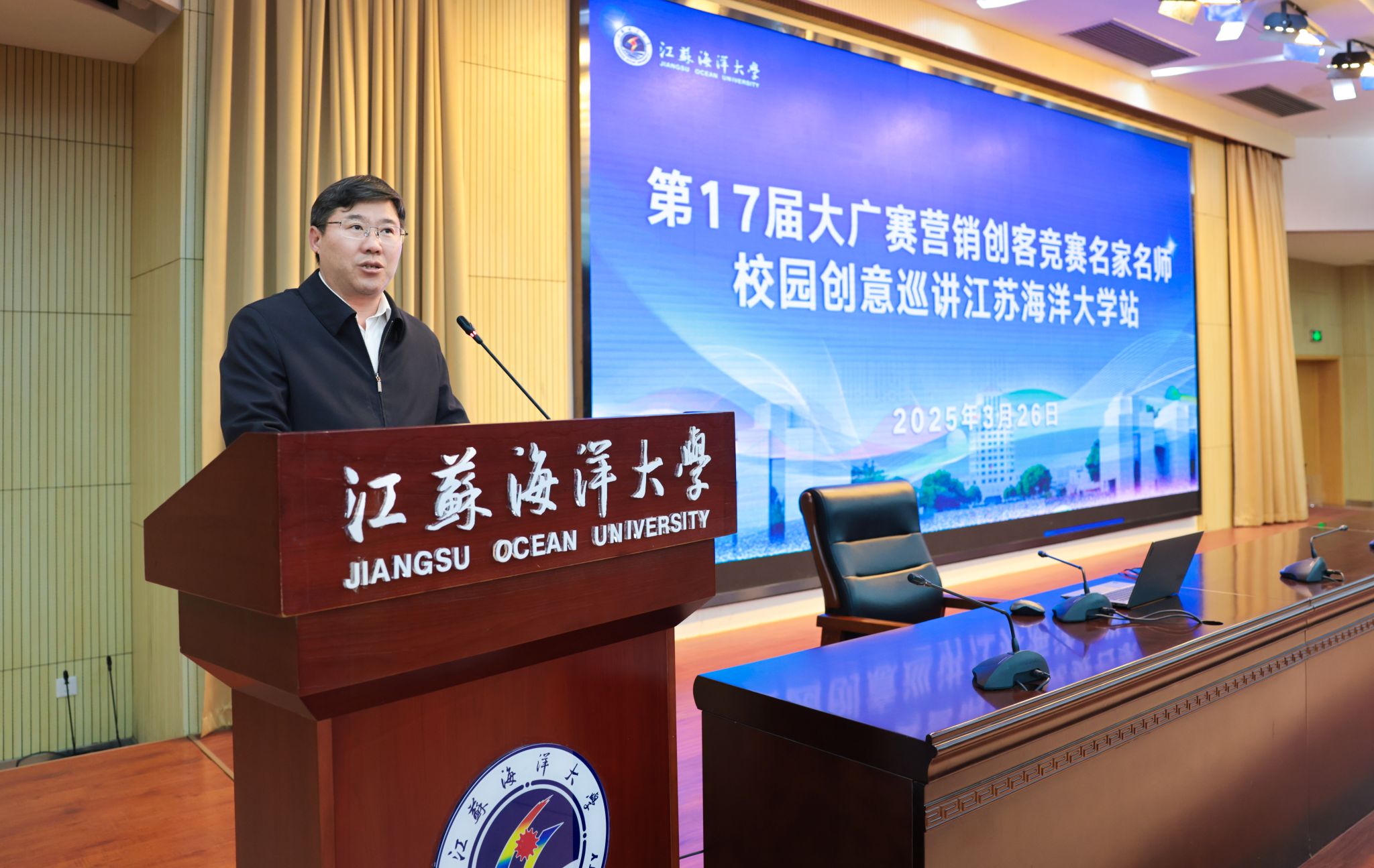 为深化产教融合,激发青年学子创新潜能,3月26日,第17届全国大学生广告艺术大赛营销创客类竞赛名家名师校园创意巡讲在江苏海洋大学苍梧校区会议中心黄海厅成功举办。本次活动由全国大学生广告艺术大赛组委会主办,江苏海洋大学商学院承办,吸引了江苏海洋大学、连云港师范学院等在连院校共300余名师生参会。副校长马廷淮出席活动并致辞。