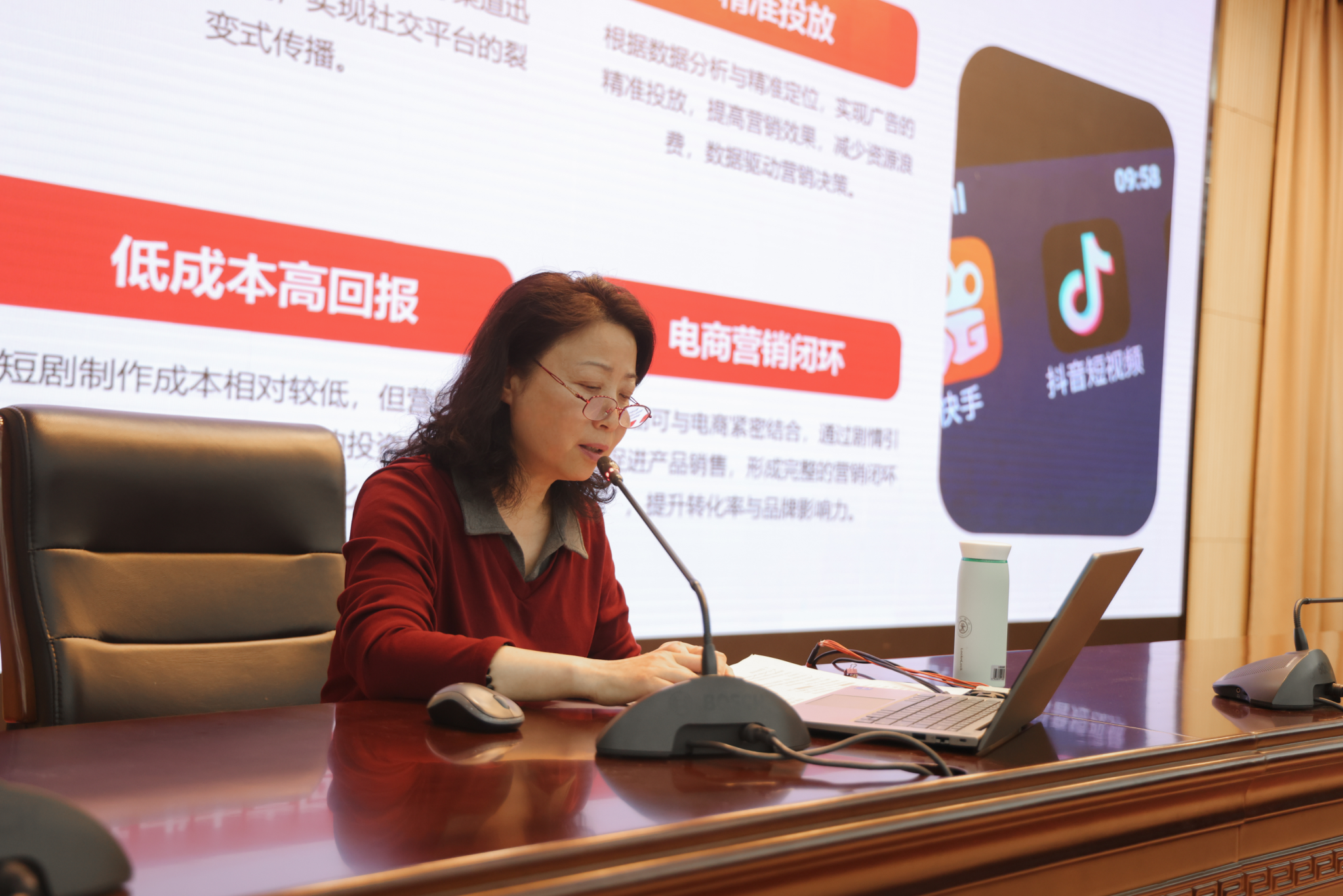 活动现场,多位行业专家分享了前沿见解与实战经验。大广赛营销创客竞赛专家评委、原中央广播电视总台导演方健教授以“三集叙事+强冲突”为模型,深入剖析微短剧创作要点,并结合非遗文化与现代品牌融合案例,为师生提供了创作灵感。大广赛营销创客竞赛专家评委、原中央电视台主编梅丽老师则从算法推荐机制出发,解析“黄金三秒”法则,强调通过情绪共鸣与差异化人设实现流量突破。曲江文化产业集团新媒体事业部直播BU总监陶一鸣以《直播间的流量密码》为主题,系统分享了直播场景设计、话术编排及数据分析工具的应用技巧。