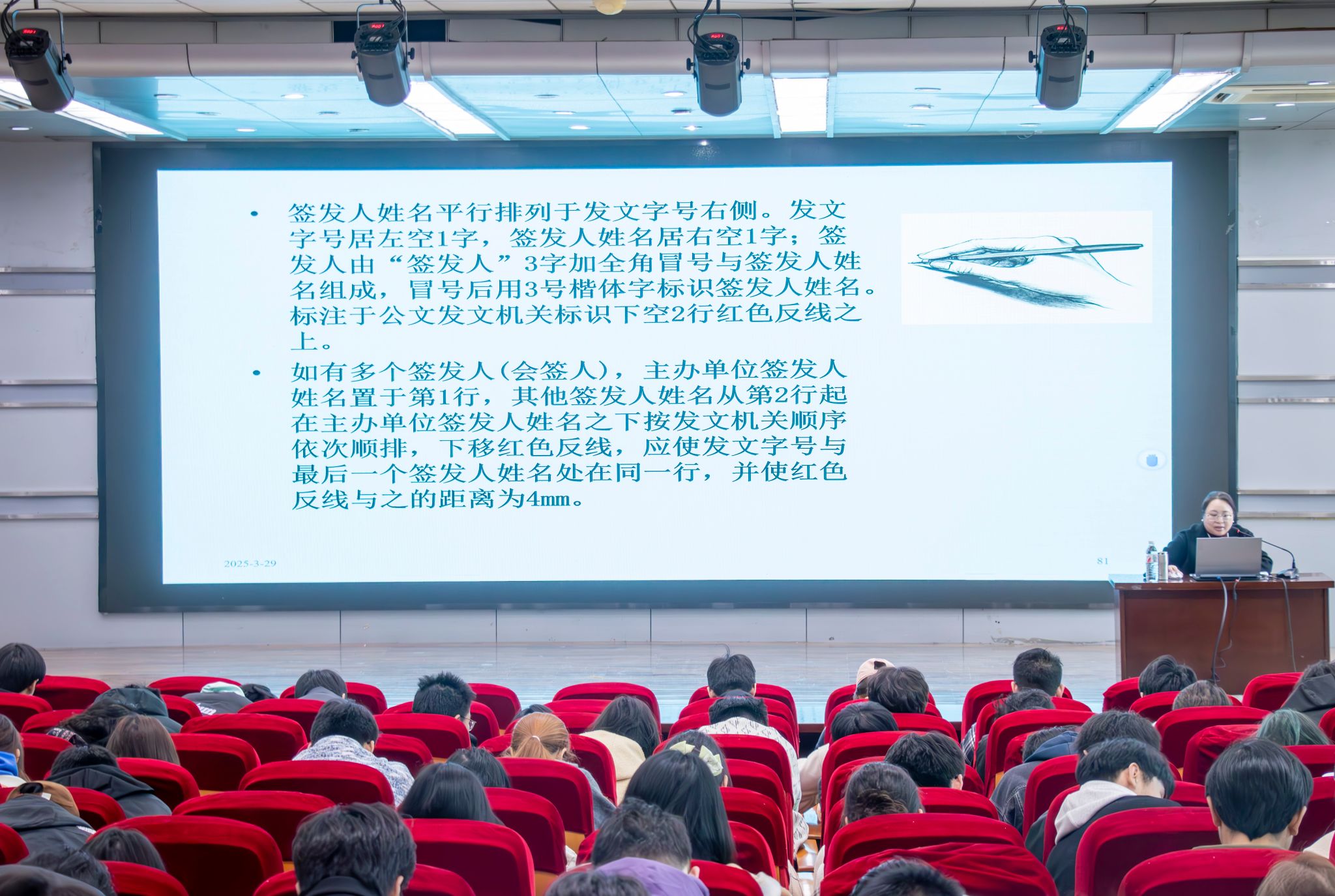 文法学院传播学副教授郭淑娟聚焦校园新闻与公文写作领域,详细讲解了校园新闻的特点及公文写作的规范要求。郭淑娟特别强调“要善于把握校园新闻与社会新闻的差异,深入对比二者特性,精细化雕琢文章,从而提升新闻内容的质量与深度。”