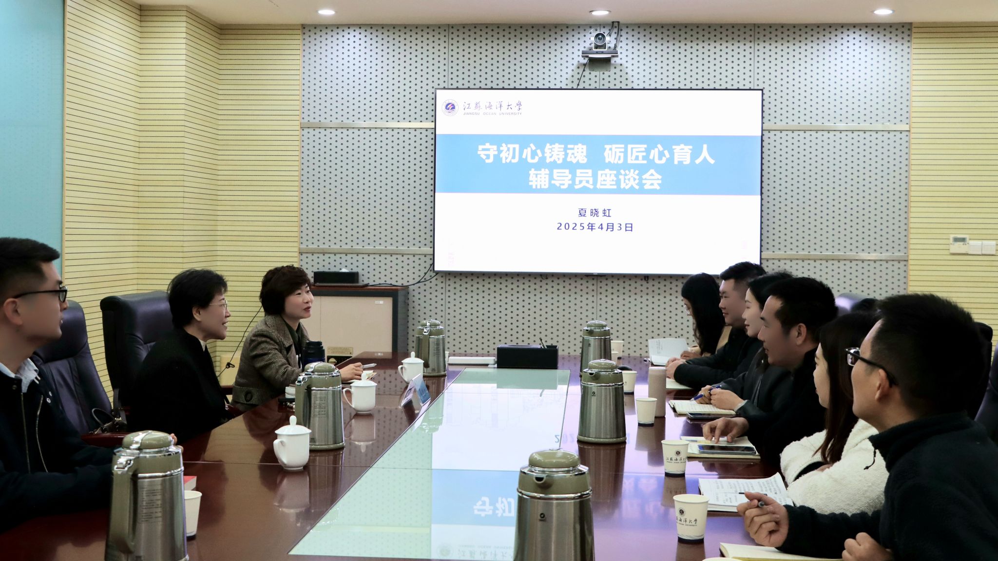 4月3日上午,我校在会议中心黄海厅开展2025年辅导员培训,特邀中国高等教育学会第七届常务理事、《高校辅导员》常务副主编、原中国高等教育学会辅导员工作研究分会秘书处办公室主任、山东大学教授夏晓虹,作《辅导员专业能力提升与职业发展》专题报告。讲座由党委学生工作部部长陈德翼主持,各学院党委副书记、全体辅导员参加。报告会前,副校长郑利军会见了夏晓虹教授。