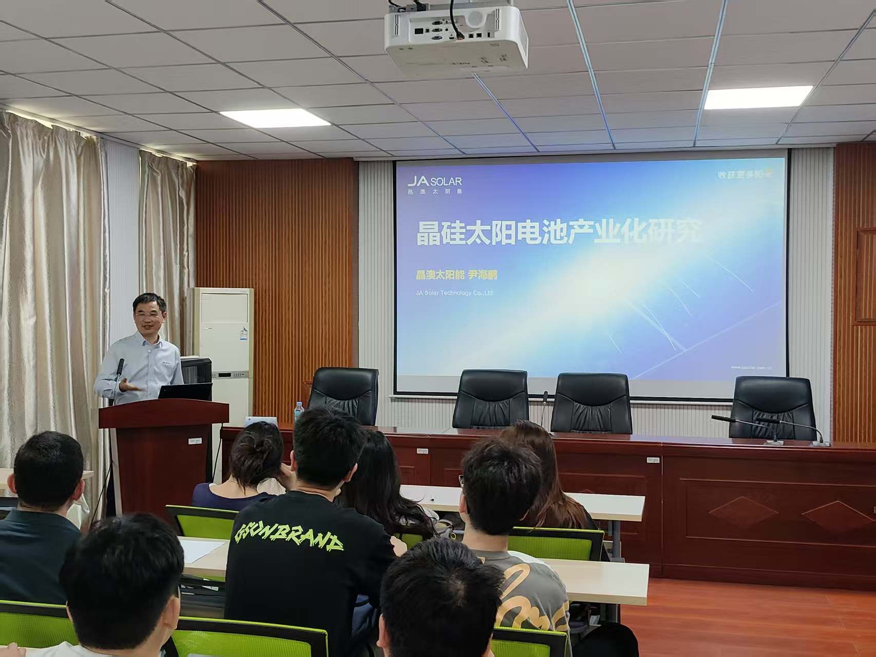 尹海鹏为新能源科学与工程专业本科生讲授了《晶硅太阳电池产业化研究进展》产业教授进课堂示范课。他通过产线实景视频、工艺参数解析和失效案例分析,生动地展现了从实验室研发到GW级量产的技术跃迁。为学生直观地阐释了理论公式背后的产业逻辑,使学生们对光伏行业的技术迭代有了全新的认知。课堂气氛活跃,课后讨论环节学生争相提问问题,尹海鹏为同学们做了详细解答,并鼓励学生脚踏实地、锻炼本领,为我国清洁能源产业,特别是光伏产业发展做贡献。