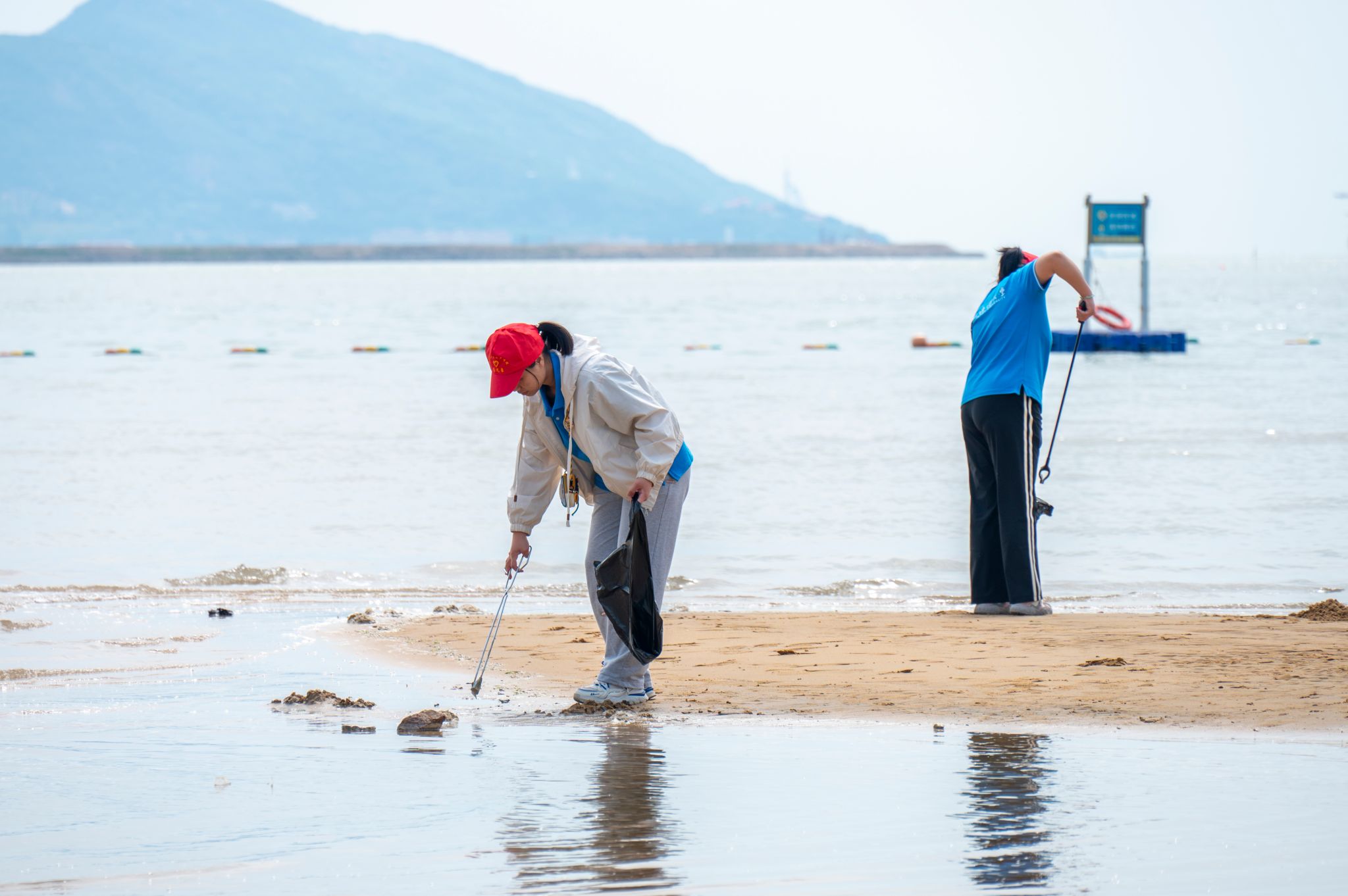 活动中,学生志愿者们身着红马甲,两到三人一组展开净滩行动。他们手持垃圾夹、环保袋等工具,对海滩上的塑料瓶、泡沫碎片、烟头、包装袋、渔网等废弃物进行拉网式清理。部分废弃编织袋深埋沙滩中,志愿者们仍耐心挖出。尽管天气炎热,同学们热情高涨,共清理垃圾30余袋,并统一移交环卫人员处理。经过努力,海滩环境焕然一新。