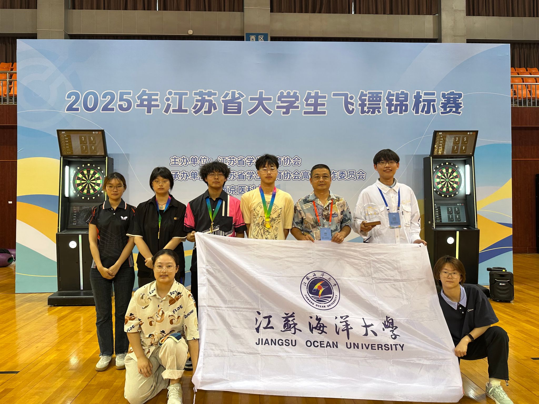 5月31日至6月2日,2025年江苏省大学生飞镖锦标赛在南京医科大学江宁校区体育馆举行。我校飞镖队派出7名队员参加甲组4个赛项的争夺,陶文轩同学获得了甲组女单冠军,陈浩、扶洋帆江获得男双亚军。我校团体总分在23所甲组本科院校中位列第七。