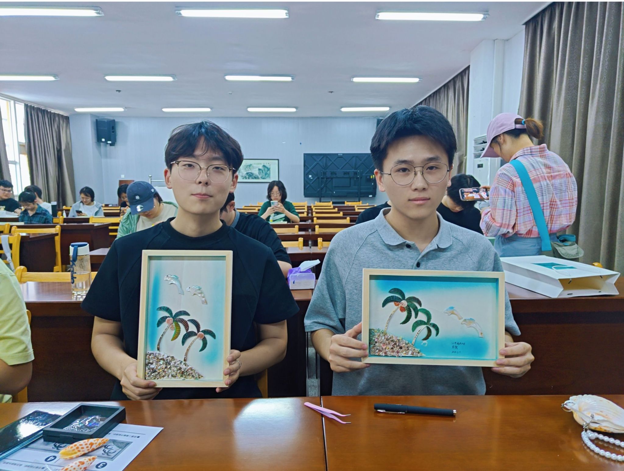 活动现场,陈建国老师及其助手分别讲授了贝壳的种类、特点和形成过程;深入浅出介绍了贝雕的历史渊源、制作技艺和文化内涵。还展示了部分有代表性的精美⻉雕作品,现场学生通过近距离观摩贝雕画作,深刻感受到海洋文化遗产传统工艺“化平凡为神奇”的魅力。实践环节中,图书馆为同学们提供了20套免费专属贝雕材料包和工具,在老师的指导下,学生亲手制作贝雕作品,设计造型,在拼贴中感受传统工艺的精妙。两位同学的作品将收藏在连云港老街的贝雕博物馆里。