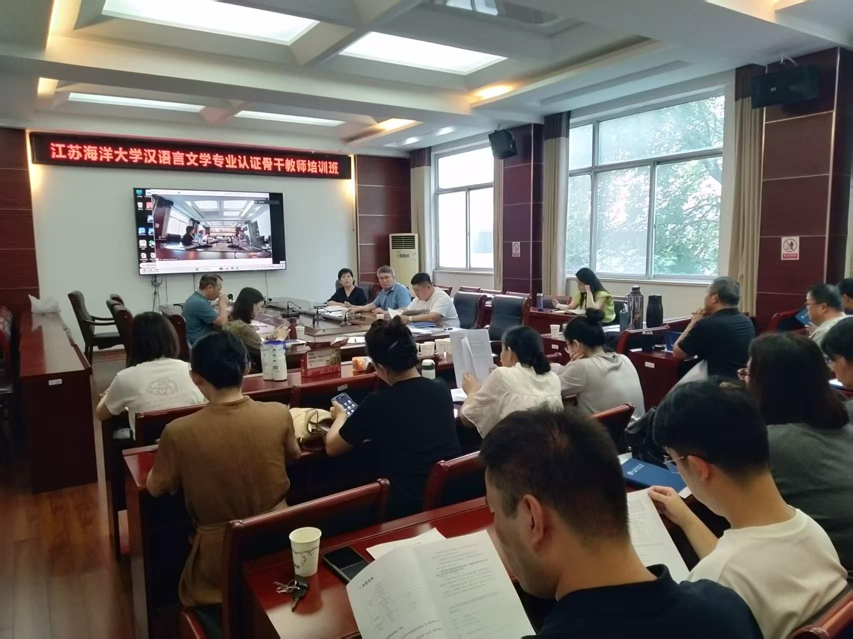 为进一步提升教师对新文科认证工作的认识,将认证理念深度融入专业内涵建设,推进专业高质量内涵式发展,8月25日下午,文法学院在文渊楼216会议室举行新文科专业认证培训,集中观看“长三角新文科教育专业认证联盟2026年度受理专业骨干教师培训”线上直播,文法学院院长吴明忠、副院长颜金、党委副书记王国银和中文系全体教师参加培训,江苏海洋大学教学质量处处长兼教师发展中心主任孙国红受邀参加。会议由吴明忠院长主持。