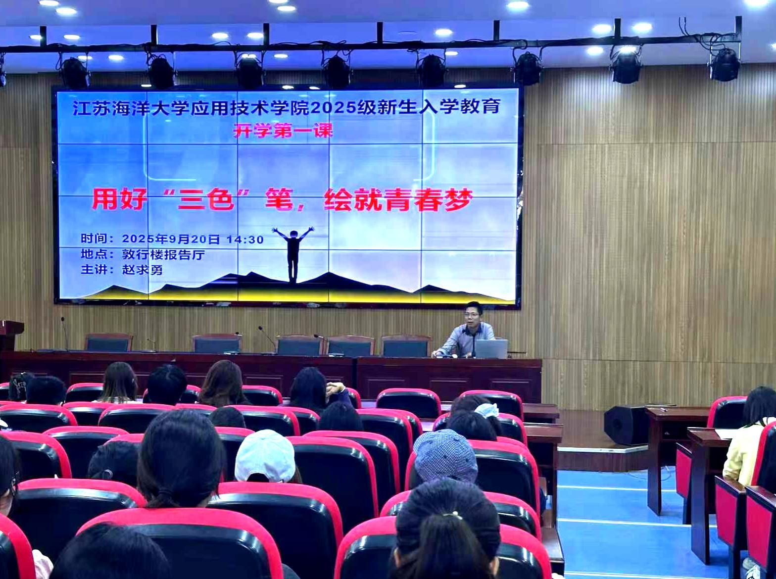 会场上,学院党委书记赵求勇以《用好“三色”笔,绘就青春梦》为题,从思想建设、个人实践、未来规划三方面,为新生上了一堂生动的课程。在思想方面,他以电影《南京照相馆》和九三阅兵为着手,深入浅出地阐述了新时代以来青年一代所肩负的历史使命与时代责任,鼓励同学们要坚定理想信念,自觉将个人成长融入国家发展和民族复兴的伟大征程中,始终以家国情怀作为成长底色。在实践方面,他强调同学们要树立梦想从学习开始、事业靠本领成就的奋斗观念,扎扎实实学习,用智慧点缀自己的大学规划,用汗水浇灌自己的大学生涯,始终以奋斗进取作为成才本色。在规划方面,他结合学校的发展史,指出同学们作为江苏海洋大学的学子,在学好本专业课程的同时,要关心海洋、认识海洋、经略海洋,始终以海洋意识作为发展特色。