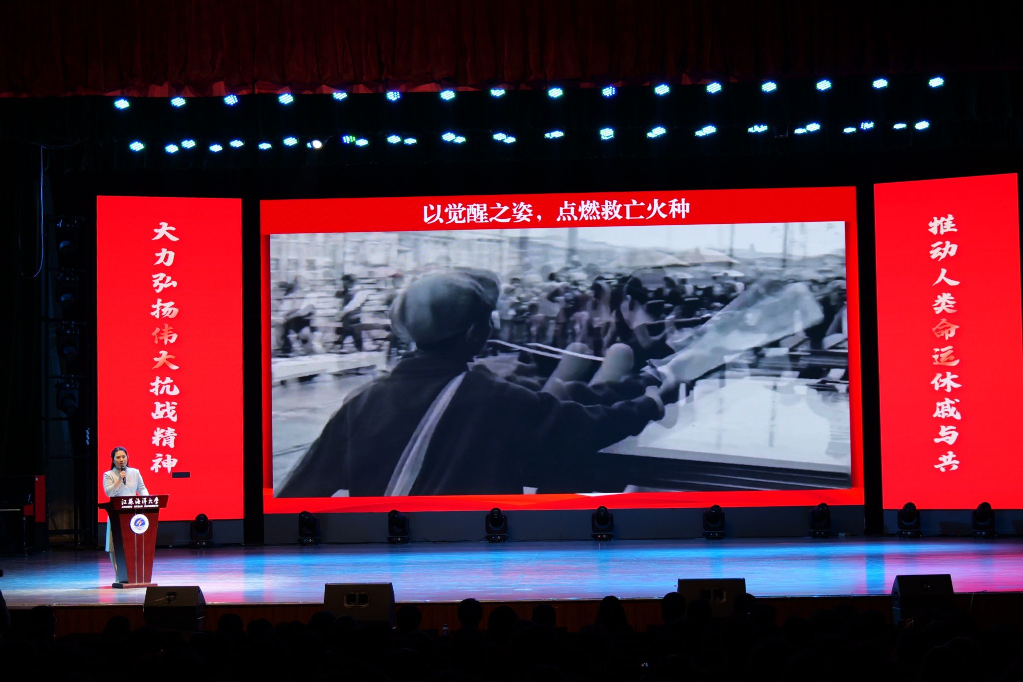 9月28日晚,江苏海洋大学“铭记历史 挺膺担当”音乐思政课在苍梧校区大礼堂举行。相关单位负责人及1300余名师生齐聚现场,同上一堂音乐思政大课,让红色历史“声”入人心。