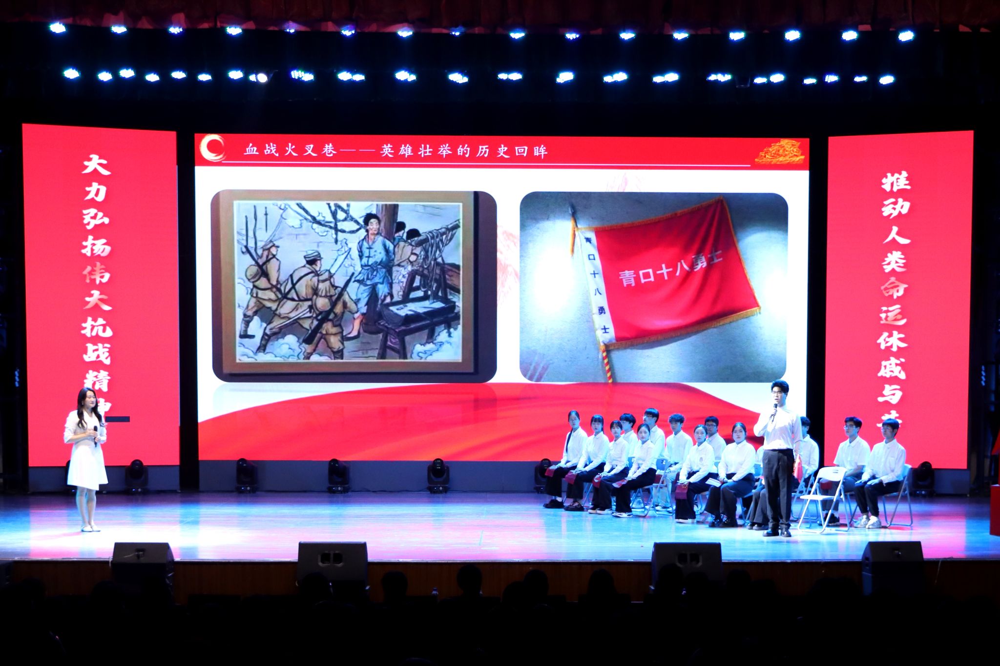 应用技术学院团委书记陈姝含通过“血战火叉巷--英雄壮举的历史回眸”“战旗永飘扬--精神内核的时代传承”“青春再出发--红色基因的现实践行”三个篇章,与同学们共同讲述了“青口十八勇士”的英雄壮举。她深情地讲道:“当历史的接力棒交到我们手中,‘爱国’这两个字便有了青春模样。让我们以英雄为镜,奋力书写中国式现代化建设挺膺担当的青春篇章。”