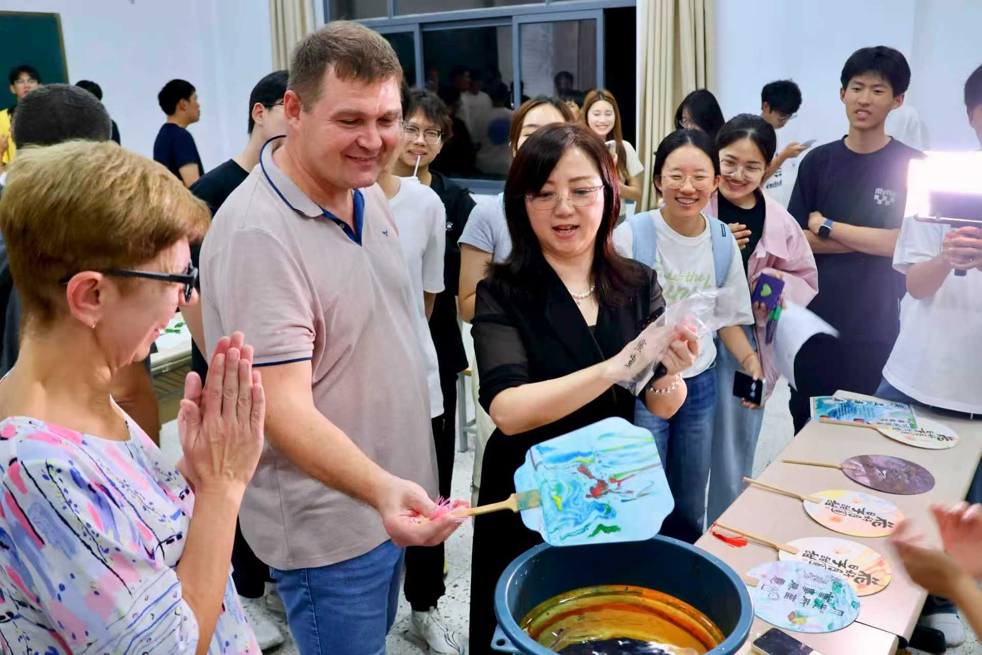 在“漆扇与方巾拓染创作工坊”,党员教师带头示范颜料调配技法,团员志愿者分组指导中外师生将“玉兔捣药”“海上明月”等中秋元素融入创作,一件件兼具审美价值与文化内涵的手作成为了中国传统文化的“流动载体”。
