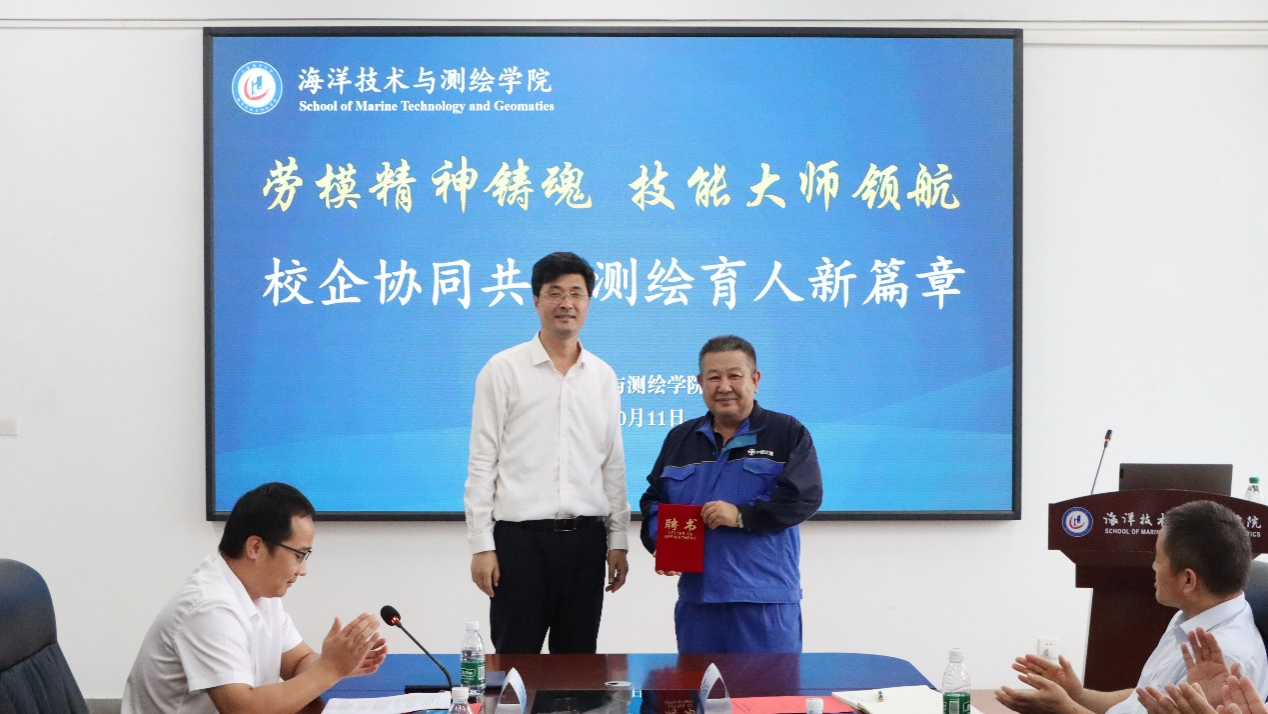 孙佳龙全面介绍了海洋技术与测绘学院近年来在人才培养、科研创新、社会服务等方面取得的成绩,强调学院事业发展取得的丰硕成果离不开行业专家与企业伙伴的大力支持,为进一步推动校企合作、强化大师引领,学院聘任陈兆海大师为校外育人导师,并为其颁发“海洋技术与测绘学院校外育人导师”聘书。