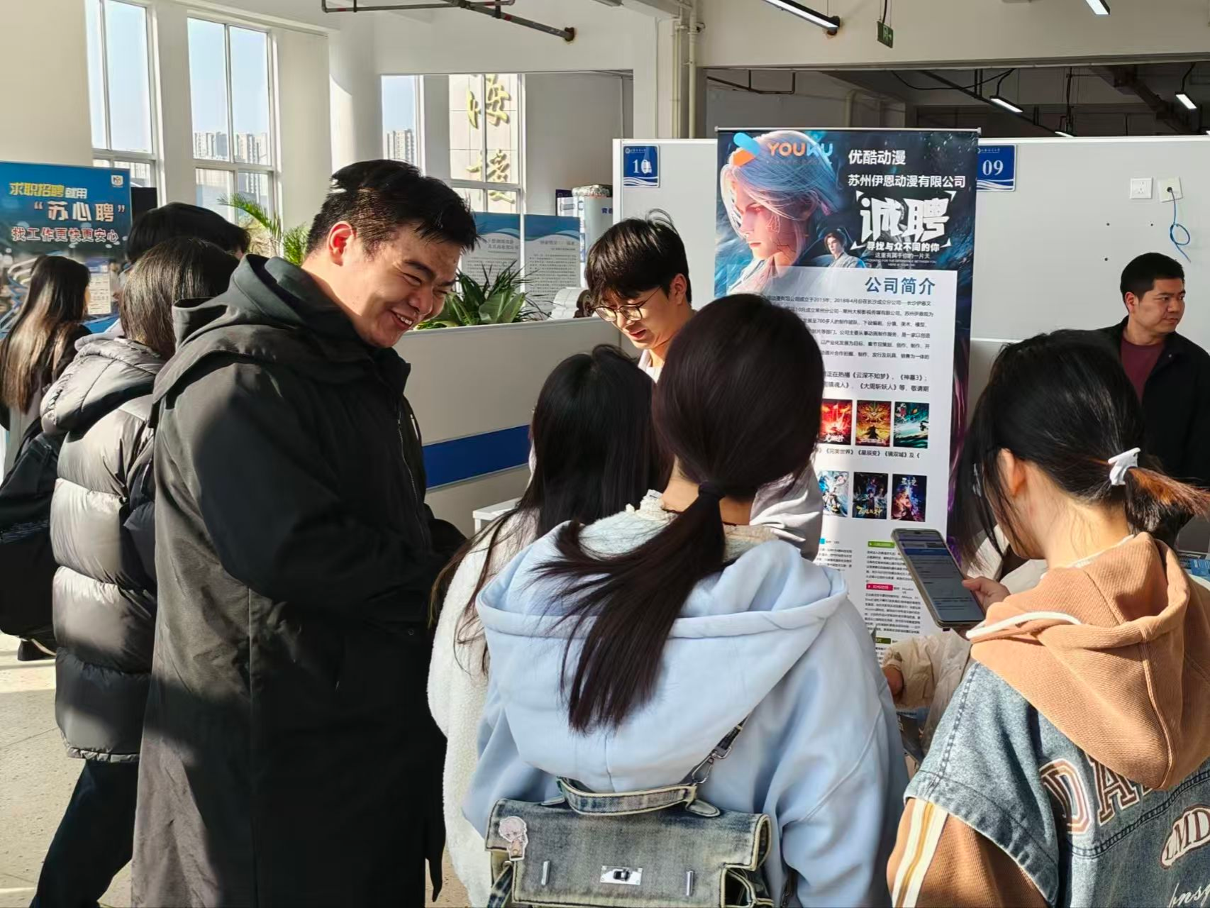 本次招聘会共汇聚23家来自游戏、设计、传媒、教育等领域的优质企业,包括上海点晴信息科技有限公司、上海彩宇文化传播有限公司、苏州伊恩动漫有限公司、江苏海州文旅集团有限公司等知名单位,提供500余个就业岗位。飞扬网络、点晴科技等企业带来游戏开发、美术设计等岗位,为数字艺术类专业学生搭建“行业初体验”的桥梁;伊恩动漫依托优酷S级动画项目,开放动画全流程实习与就业机会;新旭建设、INNER GRAVITY等公司则在设计与传媒领域提供多元化职业路径。