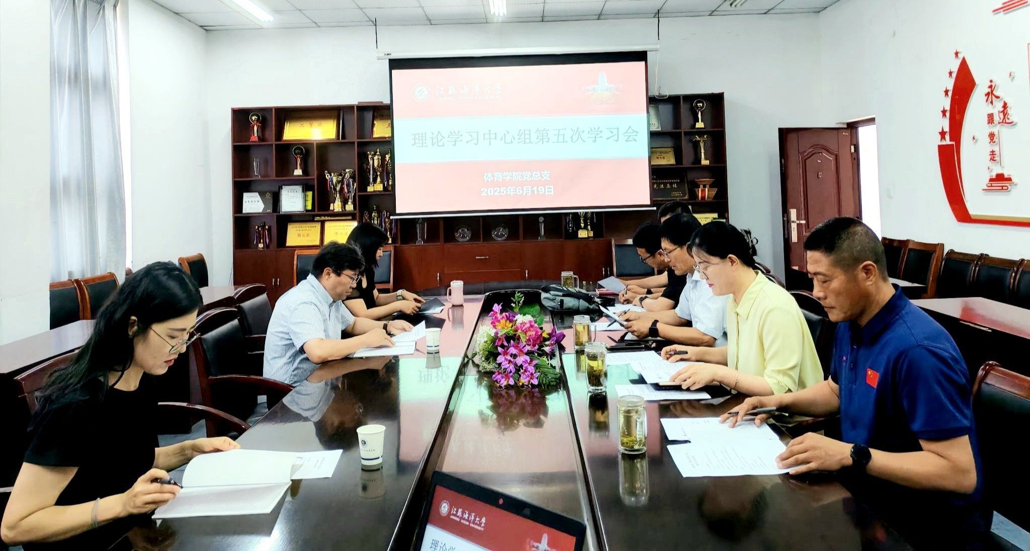 6月19日上午,体育学院党总支开展二级理论学习中心组第五次学习。会上,组织“第一议题”学习了习近平总书记关于教育的重要论述。学院党总支书记张萍用PPT带领大家学习了《学习贯彻习近平总书记在二十届中央纪委四次全会上的重要讲话精神》。院长张伦厚领学了《党政机关厉行节约反对浪费条例》。副书记李淑华和总支委员何金分别领学了《激励新时代青年在中国式现代化建设中挺膺担当》《石泰峰在深入贯彻中央八项规定精神学习教育中央指导组工作座谈会上的讲话》。李淑华围绕学习内容,结合学院上半年学生工作作重点发言。与会其他人员也围绕学习内容结合学院工作进行了交流研讨。