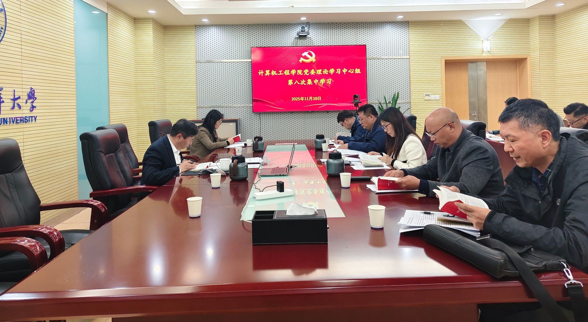 11月10日,计算机工程学院党委召开理论学习中心组集中学习会,专题学习党的二十届四中全会精神。学院党委班子成员、各党支部书记参加学习。会上,学院党委书记唐瑶等人领学了《中国共产党第二十届中央委员会第四次全体会议公报》,习近平总书记在广东考察时的重要讲话精神,以及《党的二十届四中全会〈建议〉学习辅导百问》中关于“促进科技自主创新和人才自主培养良性互动”“全面实施‘人工智能+’行动”等内容。院长仲兆满作重点发言。他围绕学院“十五五”规划提出发展思路,要以“双高协同”为契机,持续深化校企合作,加快推进海洋特色学科建设,以高水平学科建设引领学院高质量发展。