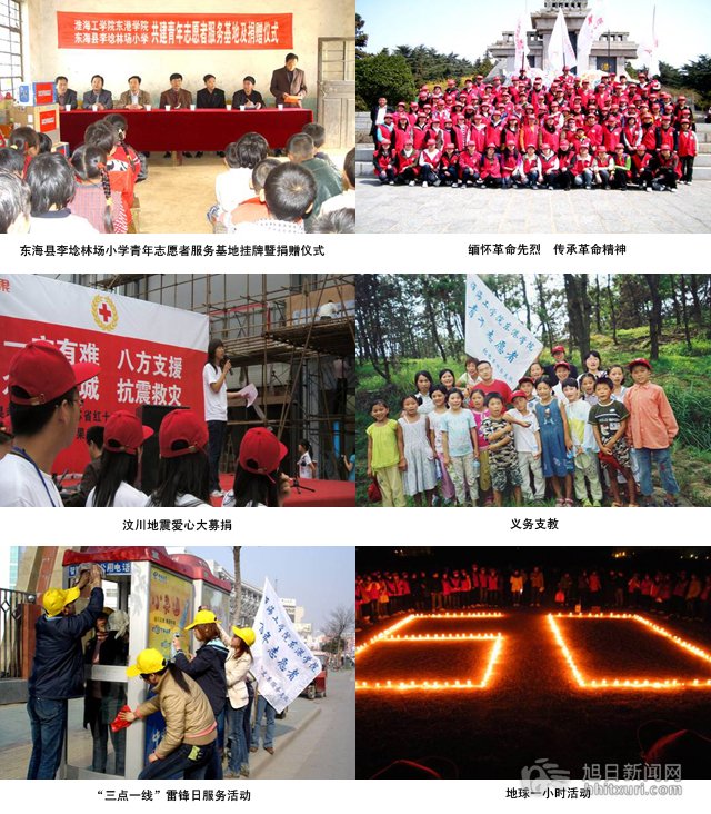 2005年3月7日,东港学院志愿者服务大队扬帆起航,踏上了志愿服务的征途。“我奉献,我快乐”的口号,伴随着志愿者服务大队走过了七年的风雨历程。如今,东港学院志愿者服务大队已经成为在全市有广泛影响,在省内有较大影响的学生先进组织。七年来,东港学院青年志愿者服务大队先后被被连云港红十字会评为“优秀志愿服务单位”,被淮海工学院团委评为社团文化巡礼组织奖、淮海工学院优秀社团、淮海工学院五四红旗团支部,有数十名青年志愿者被评为市级、校级先进个人。志愿者服务大队先后开展了“义务清洁,扮靓港城”、“手拉手爱心助学”、 “西部爱心捐赠”、“地球熄灯一小时”等特色活动;参加了连云港市无偿献血志愿者服务总队组织的“徐州拓展活动”、“世界献血者日公益晚会”、“世界志愿者日晚会”、“连云港铁路春运志愿者活动”等六十余项活动;成立了东海李埝林场小学志愿者服务基地、贾圩社区服务基地、市博物馆创办实践基地、新浦总站实践基地。