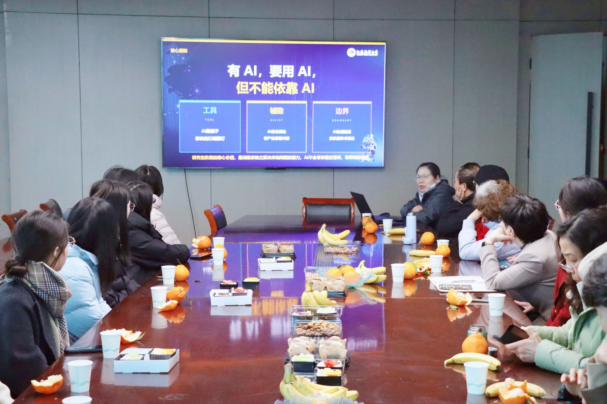 活动分为师生座谈和非遗蜡染创作体验两个环节。座谈会上,江苏海洋大学老科协会长申屠留芳作《研究生科研与论文写作》主旨报告,与大家分享了聚焦AI时代科研工作的新特点,围绕研究生工作的三大困境,重点讲解了AI赋能底层逻辑与实操方法,从学术诚信规范要求,明确AI辅助科研的原则和边界,为研究生科研与论文写作提供专业指导。现场师生还围绕研究生科研困惑、学业和职业规划等方面深入交流,老专家们耐心答疑。现场备有甜品和水果,节日氛围温馨浓厚。