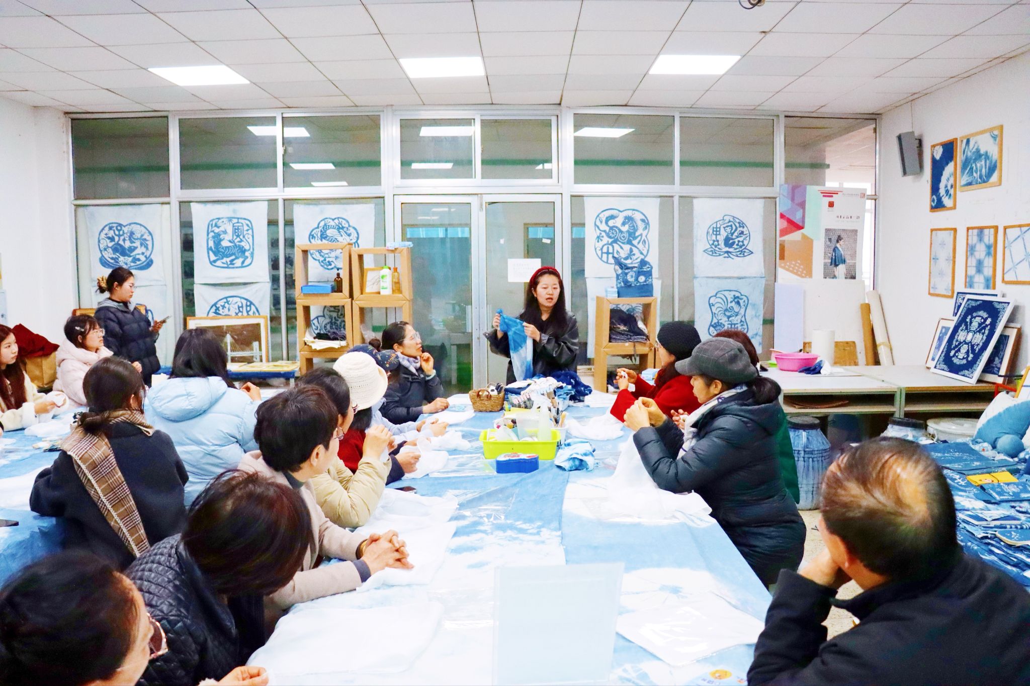 蜡染工作室开展非遗体验活动中,在冯震老师及其学生助手的指导下,师生们精心构思,体验蜡染制作工艺,一件件特色蜡染作品相继创作成型。活动中,师生共同感受传统非遗的文化魅力,在互动中舒缓身心、增进情谊。活动最后,大家展示蜡染作品并合影留念。