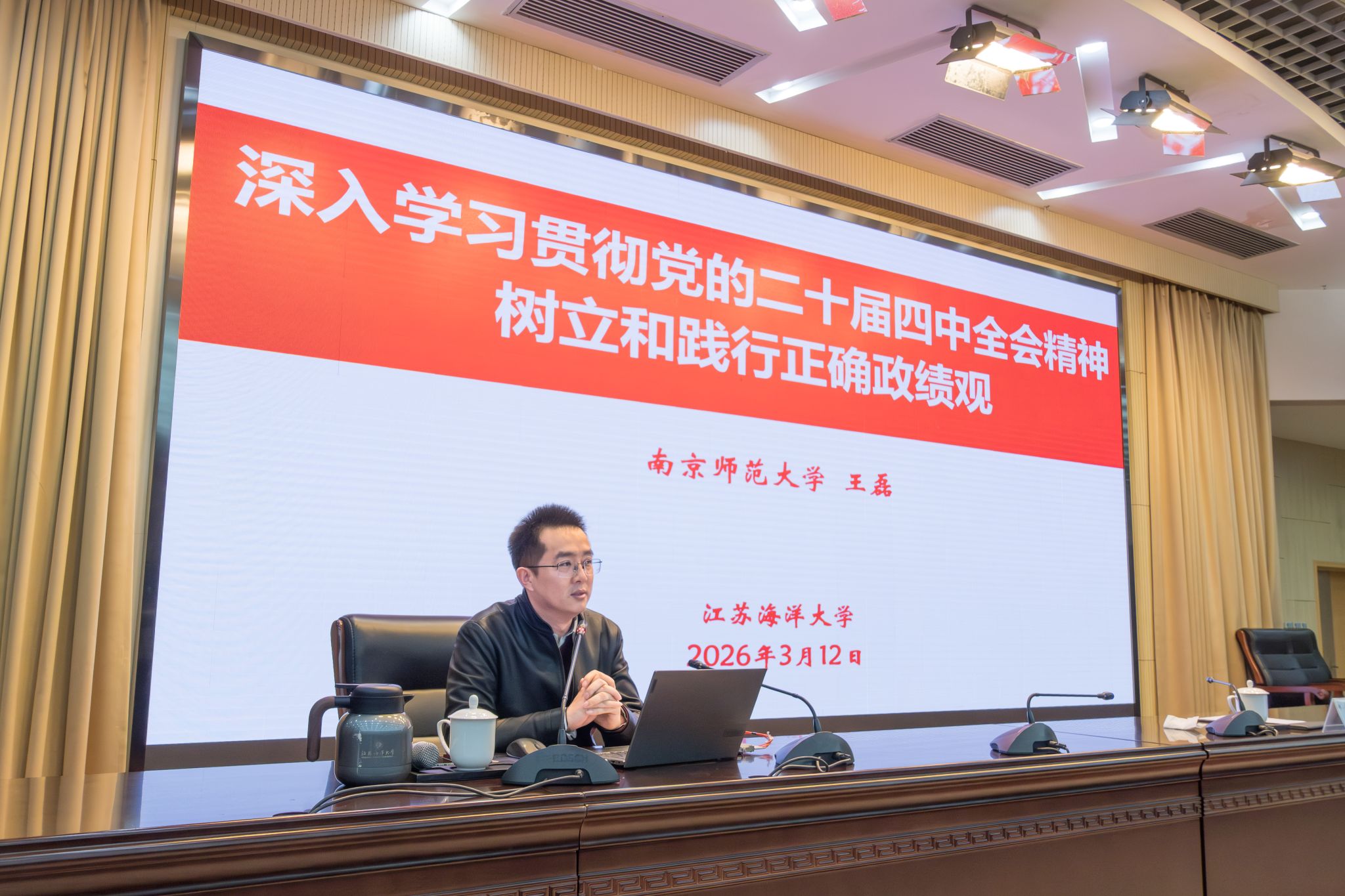 为深入学习贯彻党的二十届四中全会精神,引导广大师生深刻理解和践行正确政绩观,3月12日下午,我校在会议中心黄海厅举办“劳模工匠进校园”——学习贯彻党的二十届四中全会精神,树立和践行正确政绩观专题宣讲活动。活动特邀全国总工会“中国工人大思政课”专家名师团成员、南京师范大学马克思主义学院副院长王磊教授作专题辅导报告。我校师生代表300余人到场学习。