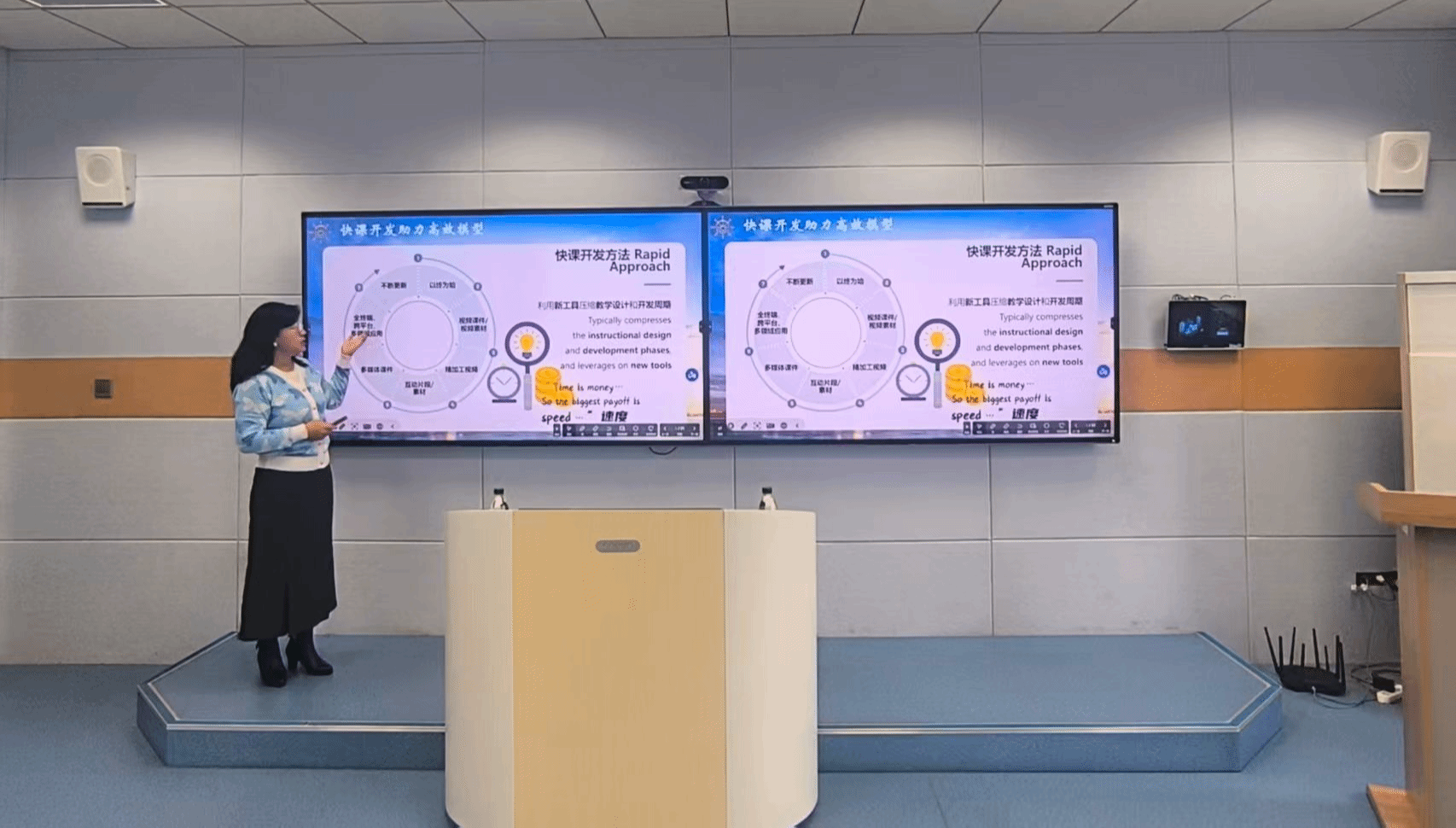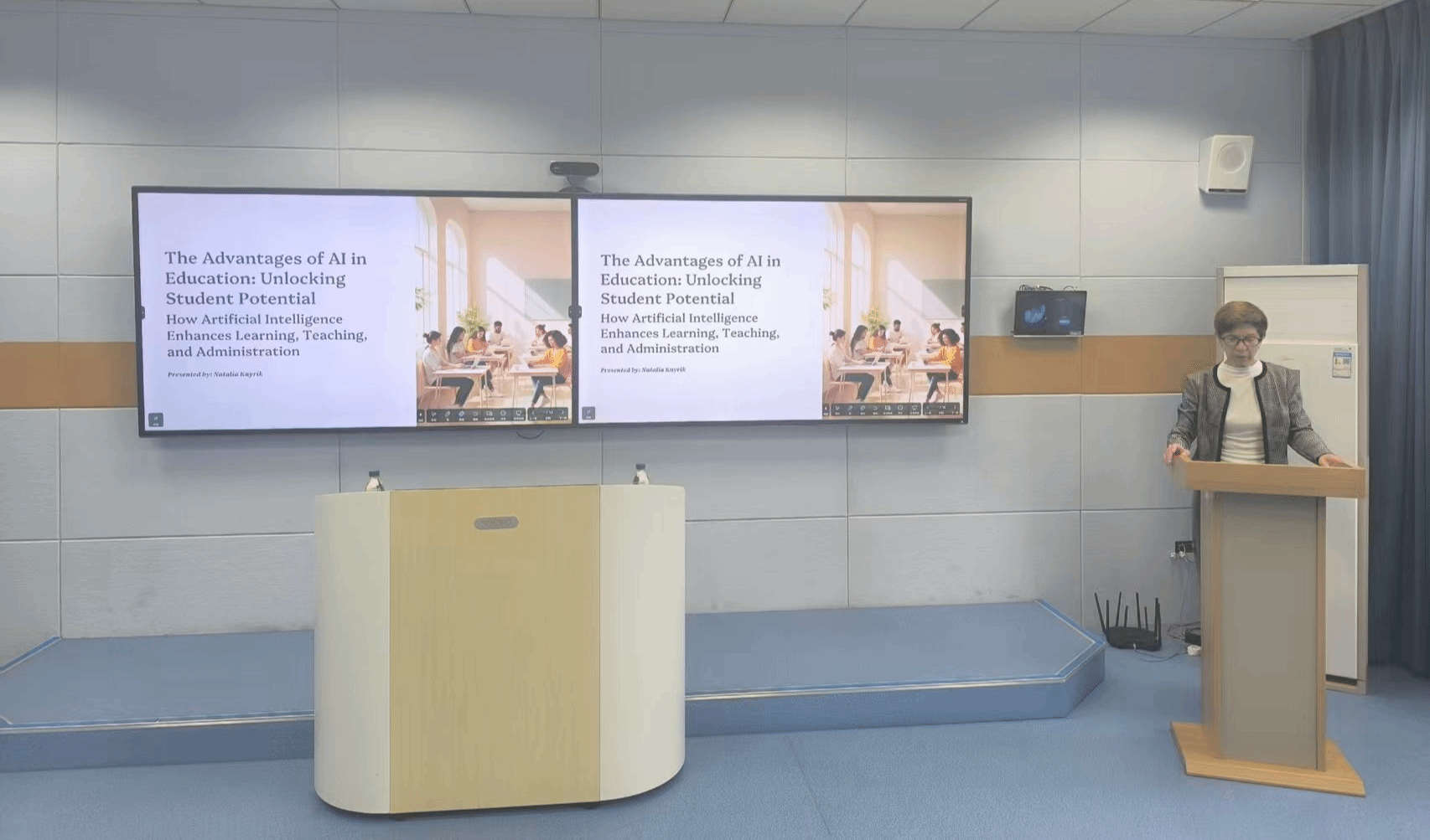 外籍教师Natalia Knyrik系统阐释了人工智能在教育领域的核心优势,肯定了AI在打造个性化学习路径、提供全天候智能辅导与即时反馈,大幅节省教师时间,提升特殊教育适配性与课堂参与度、早期干预课程优化等方面的优势,强调AI旨在赋能教师教学提升,助力释放学生潜能、推动教育公平与高质量发展。外籍教师Oleksandr Gerasin围绕人工智能在教育中的潜在风险作专题分享。他系统剖析AI可能导致学生毅力缺失、催生思维惰性、造成教师技能退化,存在算法偏见、弱化创造力等问题,强调教育应注重培养学生AI素养与思辨能力,理性使用AI、守护教育本质。