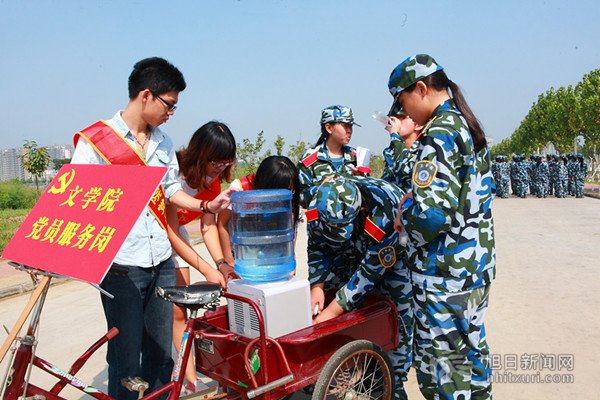 13日下午,文学院学生第一党支部的3位学生党员在A1楼附近设置了党员服务岗。路过的同学们看到他们利用自己的课余时间无私奉献,不禁竖起了大拇指。最近天气较热,新生在烈日炎炎下军训,经常汗流浃背,在军训休息期间,文学院党员服务队为他们送去矿泉水,带去一丝清凉。