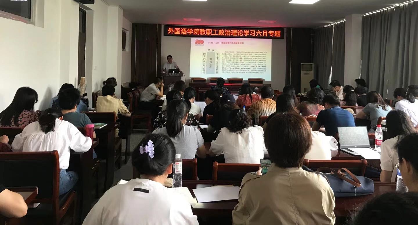 6月23日下午,外国语学院党委邀请校纪委副书记汪守建作了“从严治党的百年进程及其启示”的辅导报告。学院党委书记王波主持了报告会,全体教职工聆听了报告。
