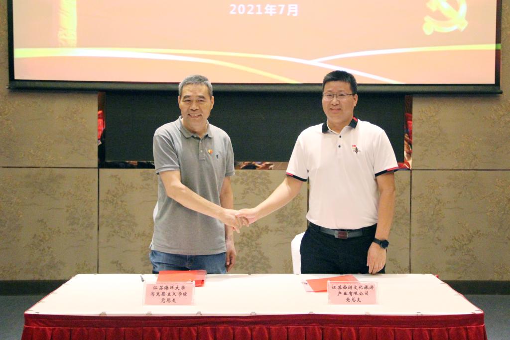 活动现场,为努力构建资源共享、优势互补、互相促进、共同提高的党建工作新格局,增强党史学习教育辐射效应,马克思主义学院党总支与西游文旅党总支签订党史学习教育共建协议。