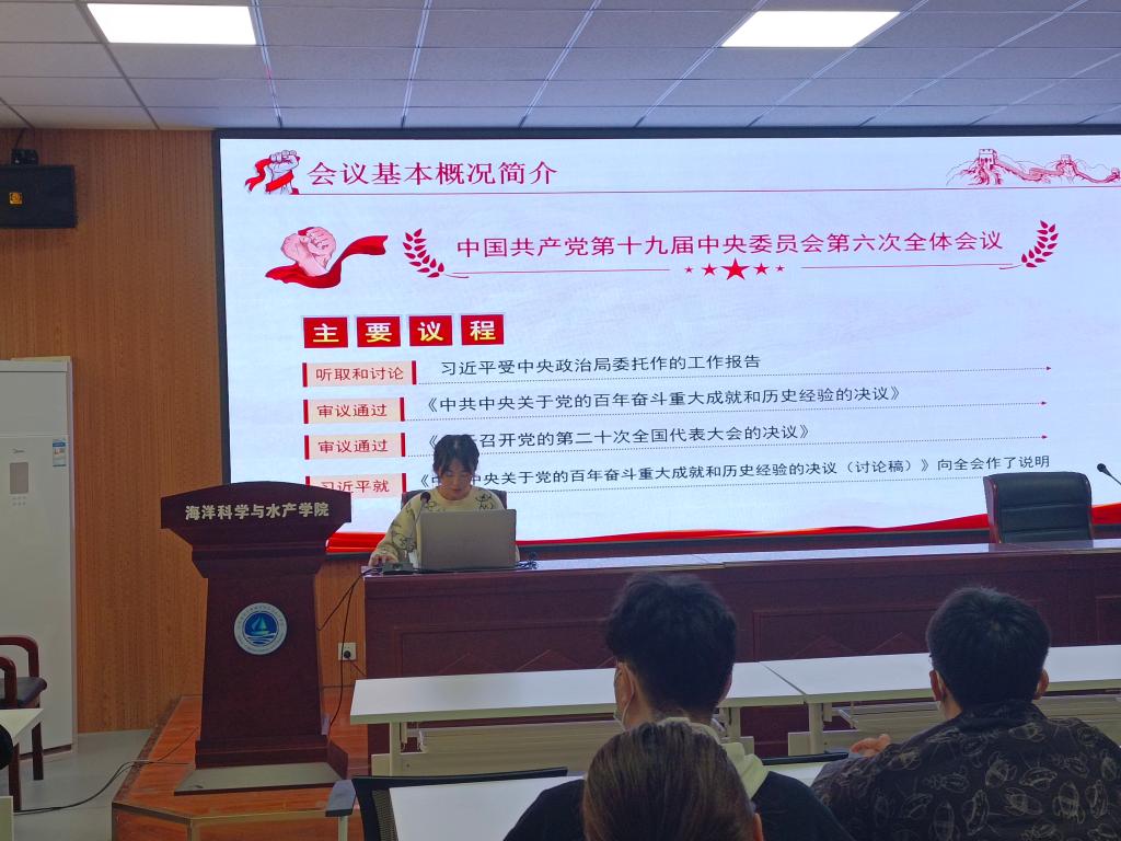 11月21日下午,海洋科学与水产学院组织学生党员、入党积极分子、学生干部学习党的十九届六中全会精神,会议由学生党员工作站组织委员董欣雨主持。