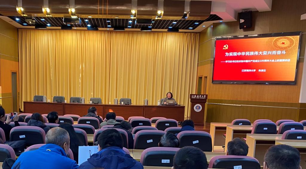 朱凌云从百年起点、百年历程、百年密码三个维度解读了中国共产党成立的伟大意义和深远影响;梳理了中国共产党百年奋斗实现中华民族伟大复兴的一个主题与四个历史阶段;揭开了中国共产党百年辉煌的成功之道,让我们全体教职工对党的百年苦难辉煌与使命担当有了更加直观的认识,对习近平总书记“七一”重要讲话有了更加深入的体会。报告中,朱凌云老师抒情与叙事结合,史实与史事结合,说理与故事结合,中间还穿插了《觉醒年代》中“南陈北李相约建党”的视频画面,让在座的教职工心灵受到极大的震撼。
