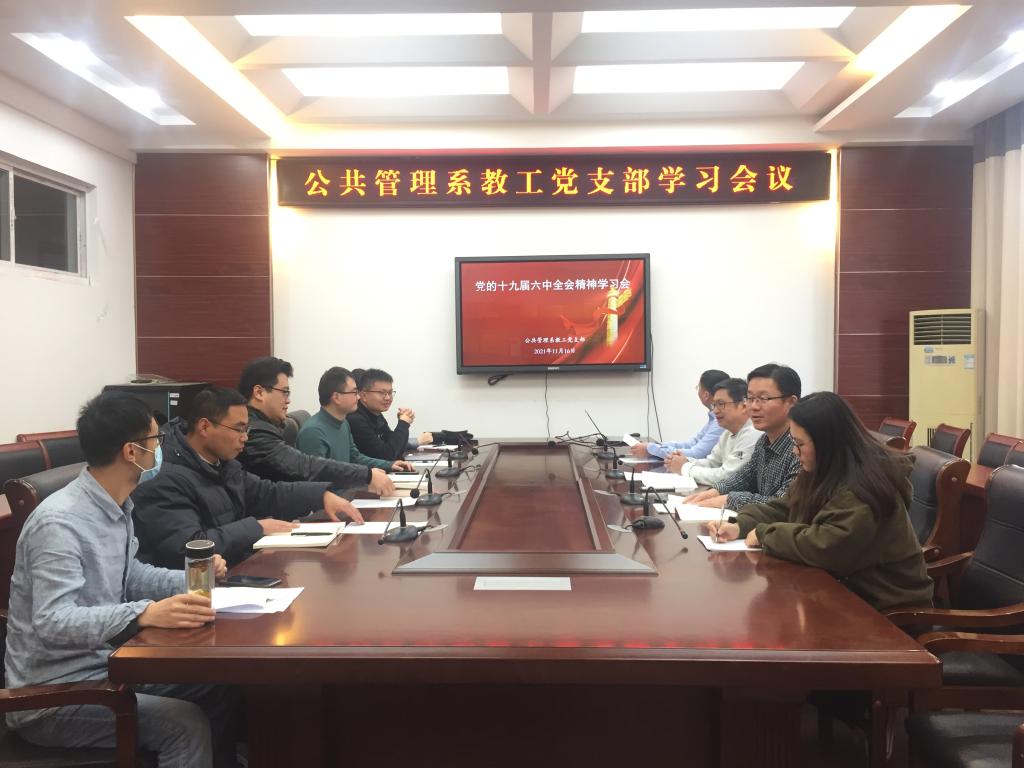 11月16日下午,公共管理系教工党支部召开学习党的十九届六中全会精神专题会议,党支部书记杨殿闯主持会议,支部全体党员参加会议。