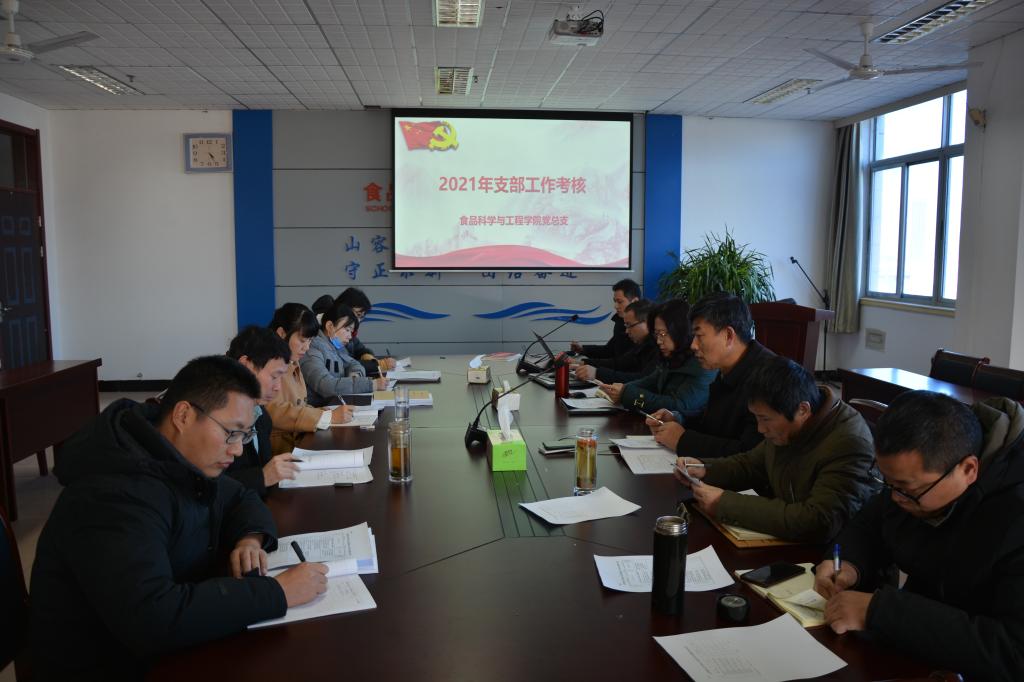 2021年12月31日上午,食品科学与工程学院党总支在主楼606会议室召开2021年度党支部工作考核暨党支部书记述职评议,学院总支书记田德勇、院长王淑军、副院长盘赛昆、副院长吴少杰、副书记郭利与全体党支部书记共同参加会议。考核会由田德勇主持。