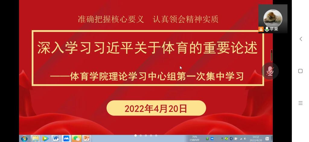 4月20日下午,体育学院理论学习中心组召开《深入学习习近平关于体育的重要论述》线上学习扩大会议,会议由党总支书记张萍主持,学院领导班子、党总支委员、各支部书记及系、教研室、中心正副主任参加了学习会。