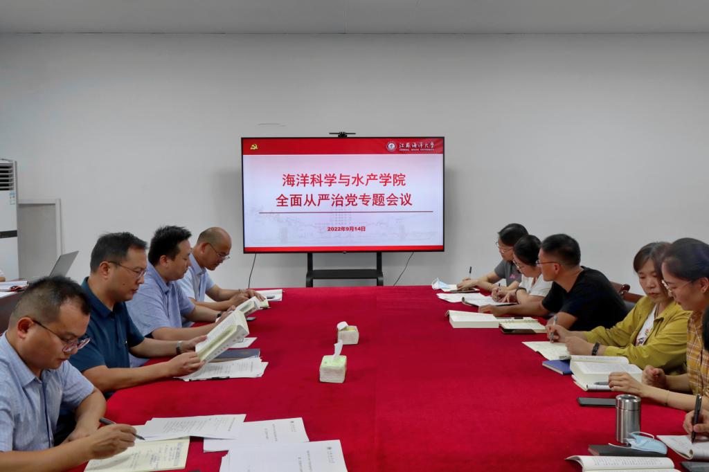 为认真落实全面从严治党主体责任,推动全面从严治党向纵深推进,9月14日,海洋科学与水产学院在海洋楼211会议室召开了全面从严治党专题会议,学院党政班子成员、院党委委员、各支部书记、各系(中心)、室等负责人参加会议。会议由学院党委副书记朱小明主持。