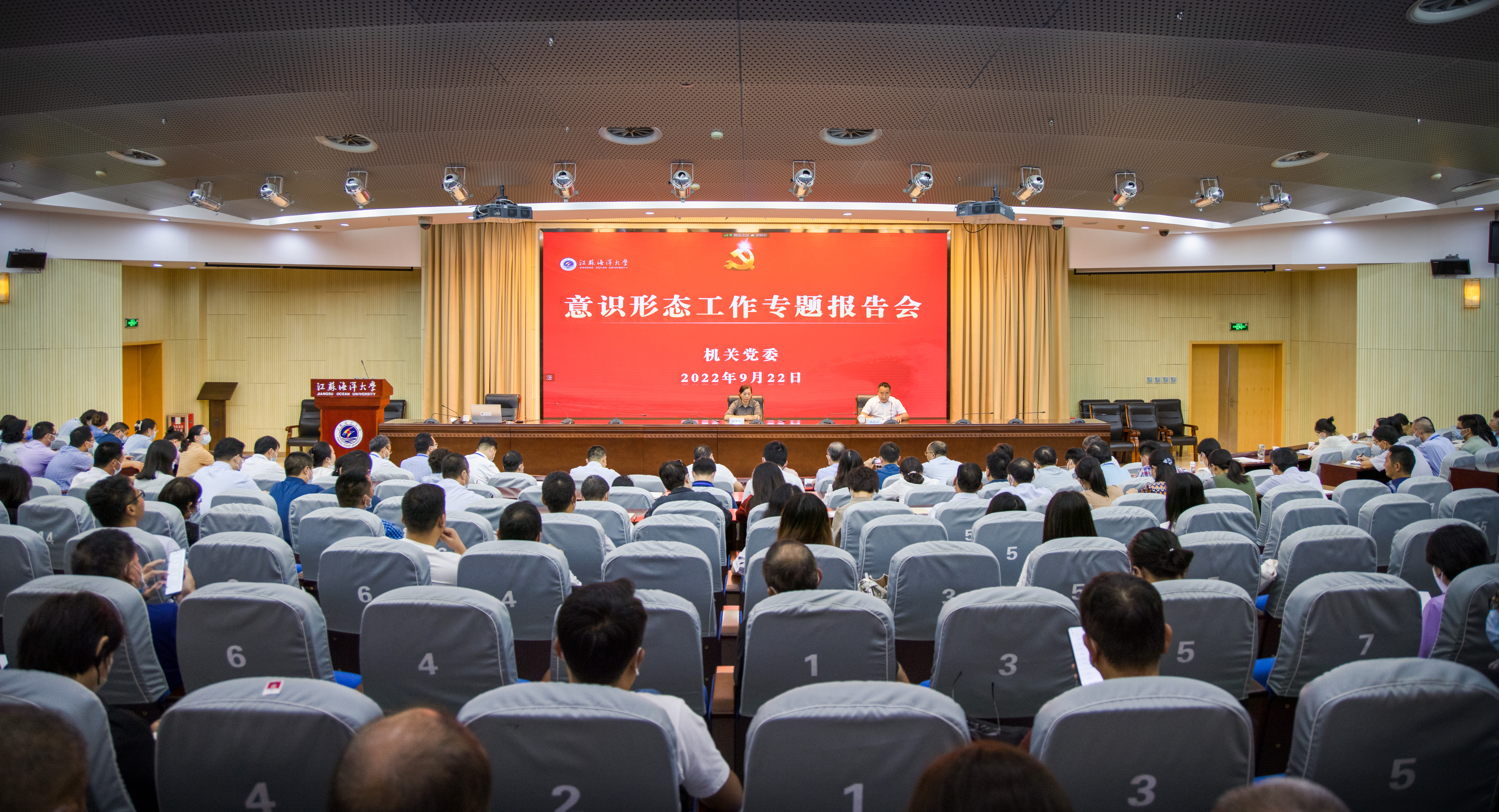 为深入学习习近平新时代中国特色社会主义思想,学习贯彻落实中央、省委和学校党委关于意识形态工作的部署要求,推动意识形态工作责任制落实落细落地,9月22日下午,机关党委特别邀请校党委常委、党委宣传部部长杨雪英教授在会议中心黄海厅作意识形态工作专题辅导报告。机关全体教职工及部分辅导员代表参加会议。机关党委书记韩振响主持会议。