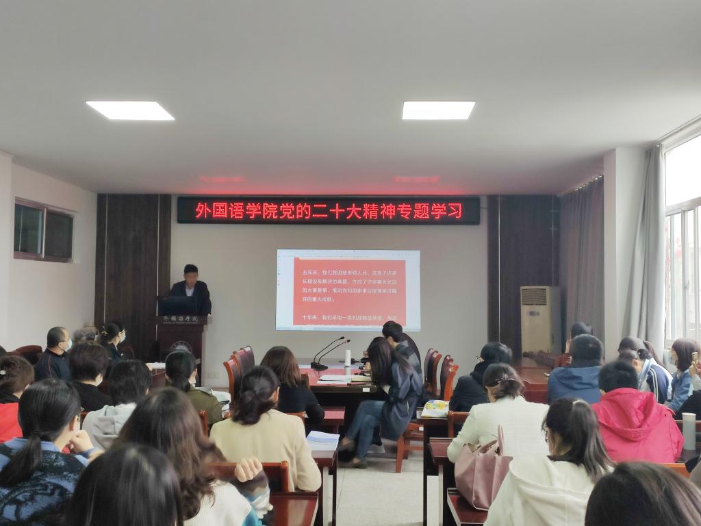 10月26日下午,外国语学院开展党的二十大精神专题学习活动,本次专题学习由学院党委书记田德勇主持,学院全体教职工参加学习。
