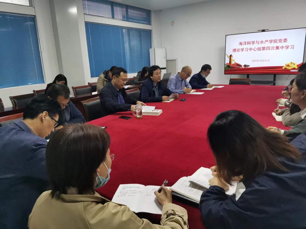 10月31日上午,海洋科学与水产学院党委理论学习中心组在海洋楼211会议室召开了第四次集中学习会,专题学习党的二十大精神。学院党委委员、党政班子成员和各党支部书记参加学习,学习会由学院党委书记黄金虎主持。