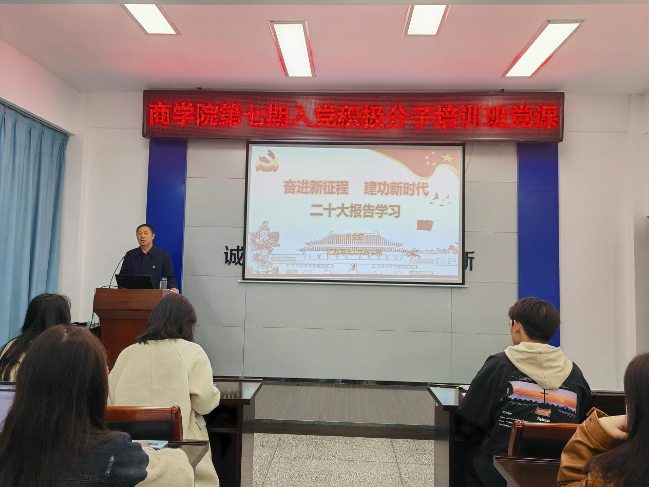 党课以“奋进新征程、建功新时代”为主题,商学院党委书记万金店为参加学院第七期入党积极分子培训班的80名同学上了一堂主题鲜明、内容充实、激励奋进的党课。万金店对同学们说到:“党的二十大吹响了迈向第二个百年奋斗目标的冲锋号,指明了以中国式现代化全面推进中华民族伟大复兴的发展方向,报告专门指出实施科教兴国战略,强化现代化建设人才支撑,我们新一代大学生要抓住这一伟大的历史发展机遇,勇担重任,建功新时代”。