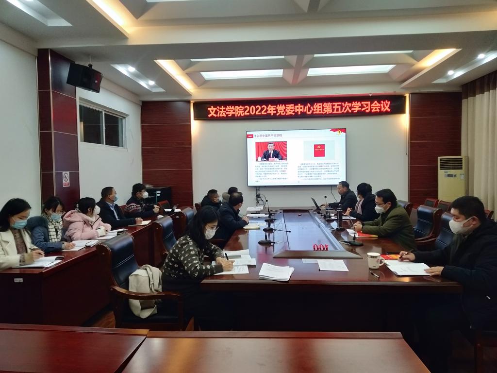 12月14日下午,文法学院党委理论学习中心组(扩大)第五次学习会在文渊楼216会议室举行。党的二十大精神专题宣讲团成员、马克思主义学院党总支书记王波副研究员应邀作《中国共产党章程(修正案)》专题辅导报告。校党委常委、宣传部长杨雪英,巡学旁听工作组成员孙晓娥一行参加旁听并现场指导。文法学院党委书记魏范青主持会议,学院党委成员、支部书记、系主任、党政办负责人参加会议。