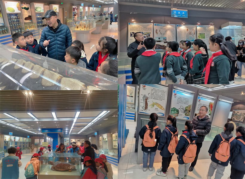 活动中,李士虎老师带领同学们来到海洋馆贝类区进行参观,用形象的比喻向同学们介绍不同种类的贝壳标本。接着同学们又参观了各种甲壳类、鱼类标本,例如龙虾、海龟、鲨鱼、飞鱼、犁头鳐等以及已经灭亡的扬子江白鲟。在科普过程中,讲解员时不时会播放相关视频进行更加直观详细的讲解,在介绍海马时,讲解员给同学们播放了雄性海马繁殖小海马的过程相关视频,引起了同学们的兴趣。对此,同学们进行了激烈讨论,并向讲解员提出自己的问题同时也得到了专业的解答。在参观藻类区时,讲解员详细介绍了紫菜从育苗到养殖再到制成紫菜成品的全过程,让同学们了解紫菜是如何从海里走上餐桌。