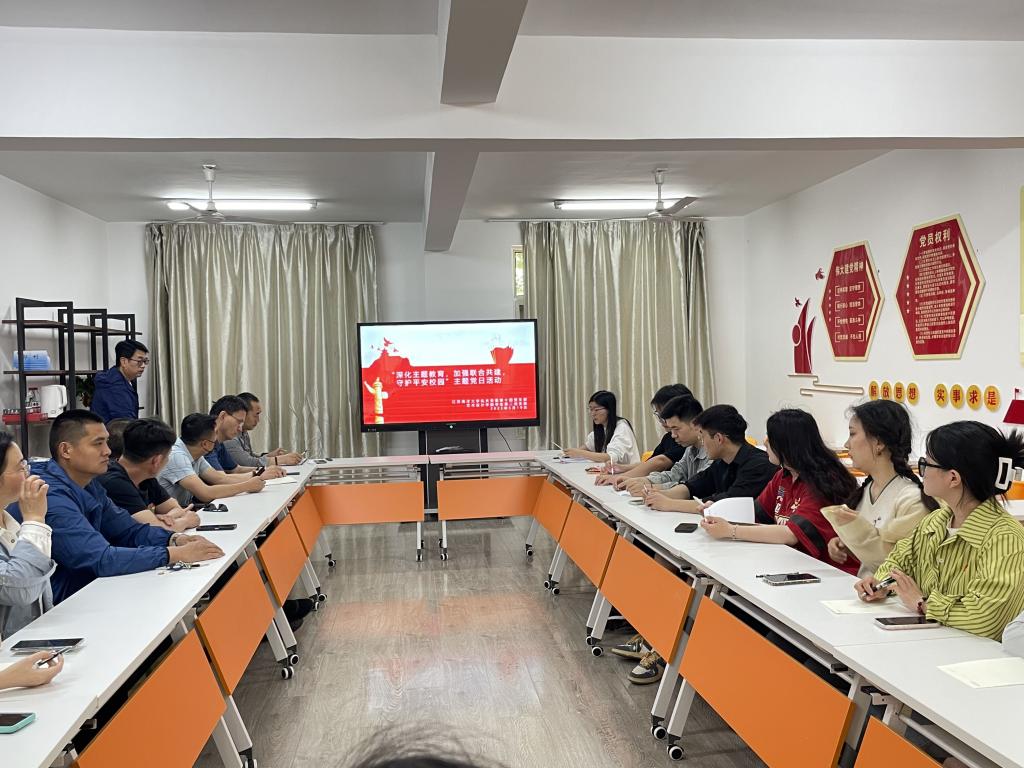 为深入开展学习贯彻习近平新时代中国特色社会主义思想主题教育,落实总体国家安全观,提高全校师生安全意识,进一步推进党支部结对共建工作,5月19日,机关党委第十四党支部联合艺术设计学院学生第二党支部联合开展了“深化主题教育,加强联合共建,守护平安校园”主题党日活动。活动由艺术设计学院学生第二党支部书记敖燕环老师主持,保卫处副处长张启磐老师,艺术设计学院副处级组织员吴良军老师以及两个支部全体党员参加。
