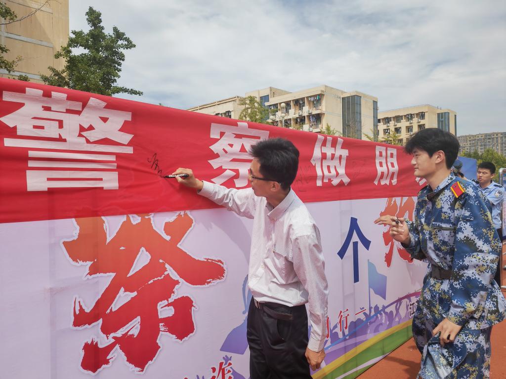 机关党委第十四党支部书记、保卫处处长姜兵带领新生代表进行反诈签名,并组织新生添加郁洲派出所民警企业微信和警察做朋友。